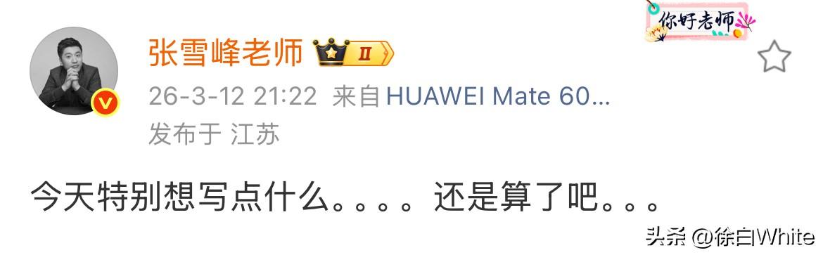 3月24日,张雪峰最后发文,“今天特别想写点什么。。。。还是算了吧。。。 ” 曾经的欲言又止,如今成了意难平,张雪峰没写出的,是什么?成了无数人心中的疑问与好奇,现在这个阶段正处于单招,或许他想说这个吧,又或许他是想说其他…… 曾经无人好奇的事,成了未解之谜…… 哎……除了叹息……似乎说不出第二个字…… 这件事告诉我们,有话就说,有事就做,因为我们永远不知道明天跟意外哪个先来