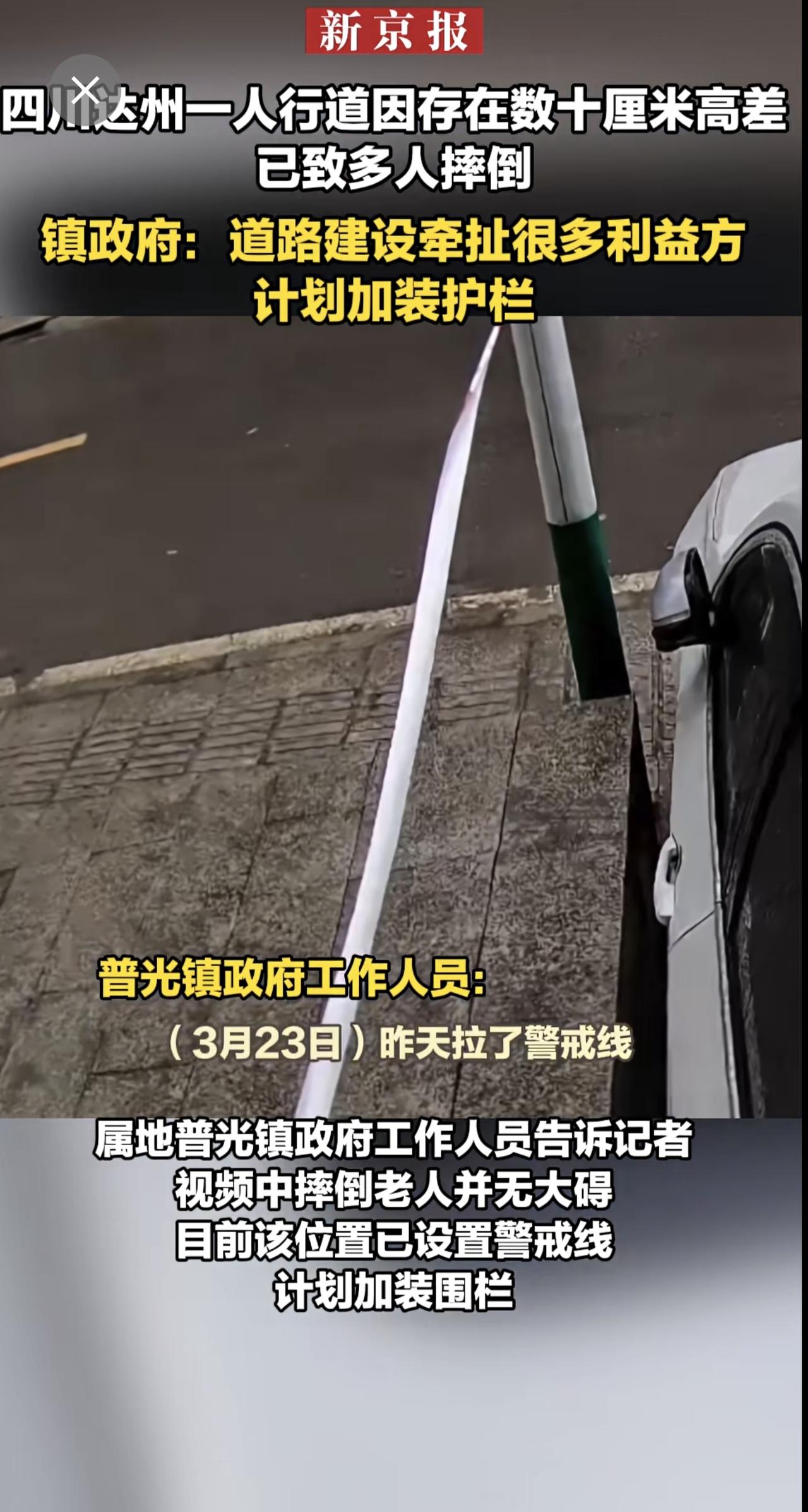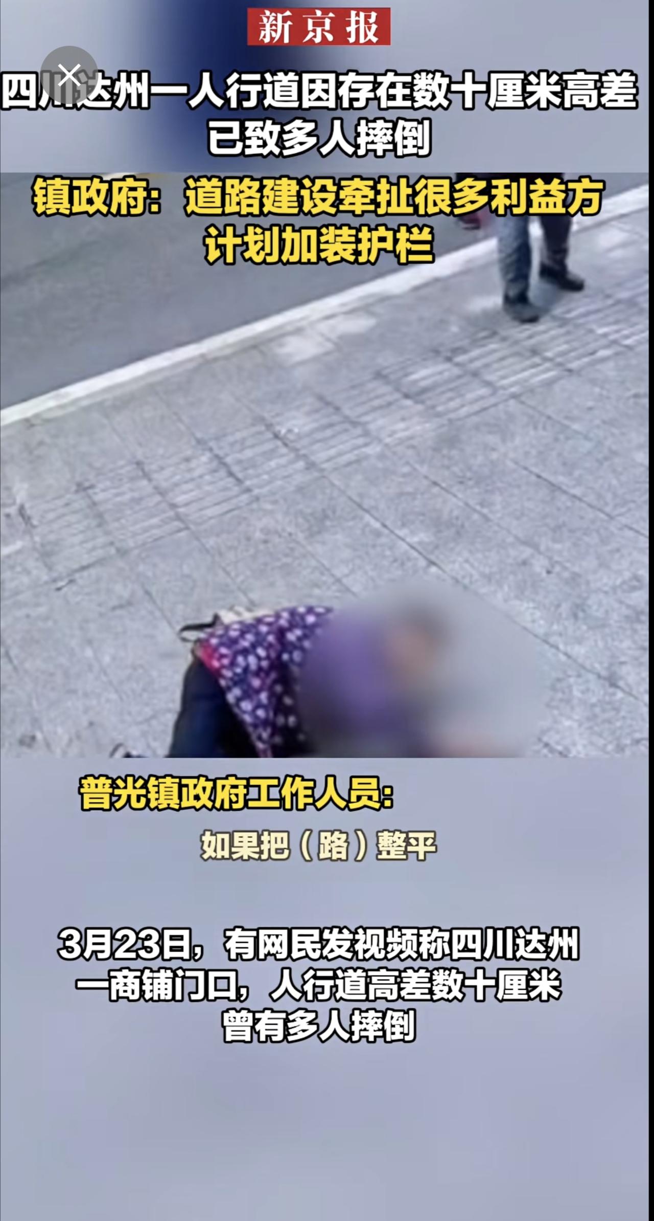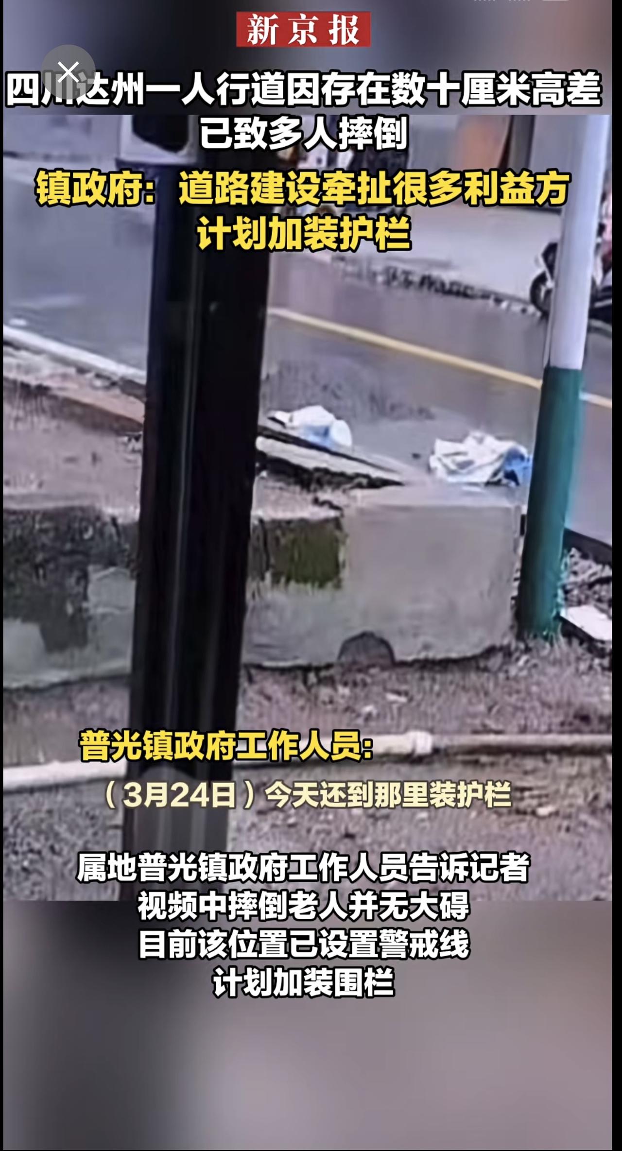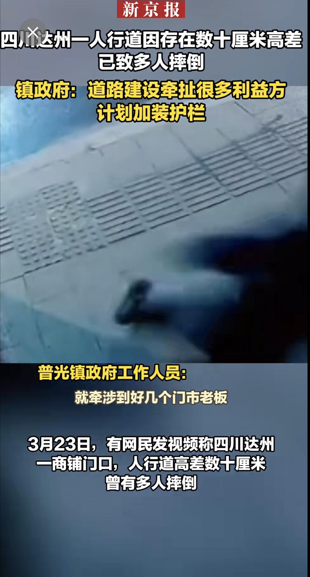 四川达州一人行道因存在数十厘米高差 已致多人摔倒 镇政府:道路建设牵扯很多利益方 计划加装护栏