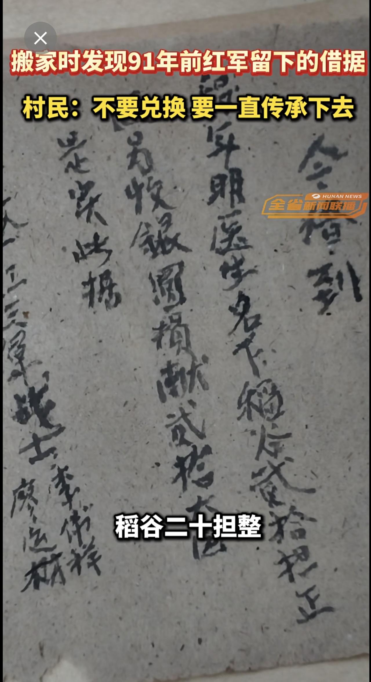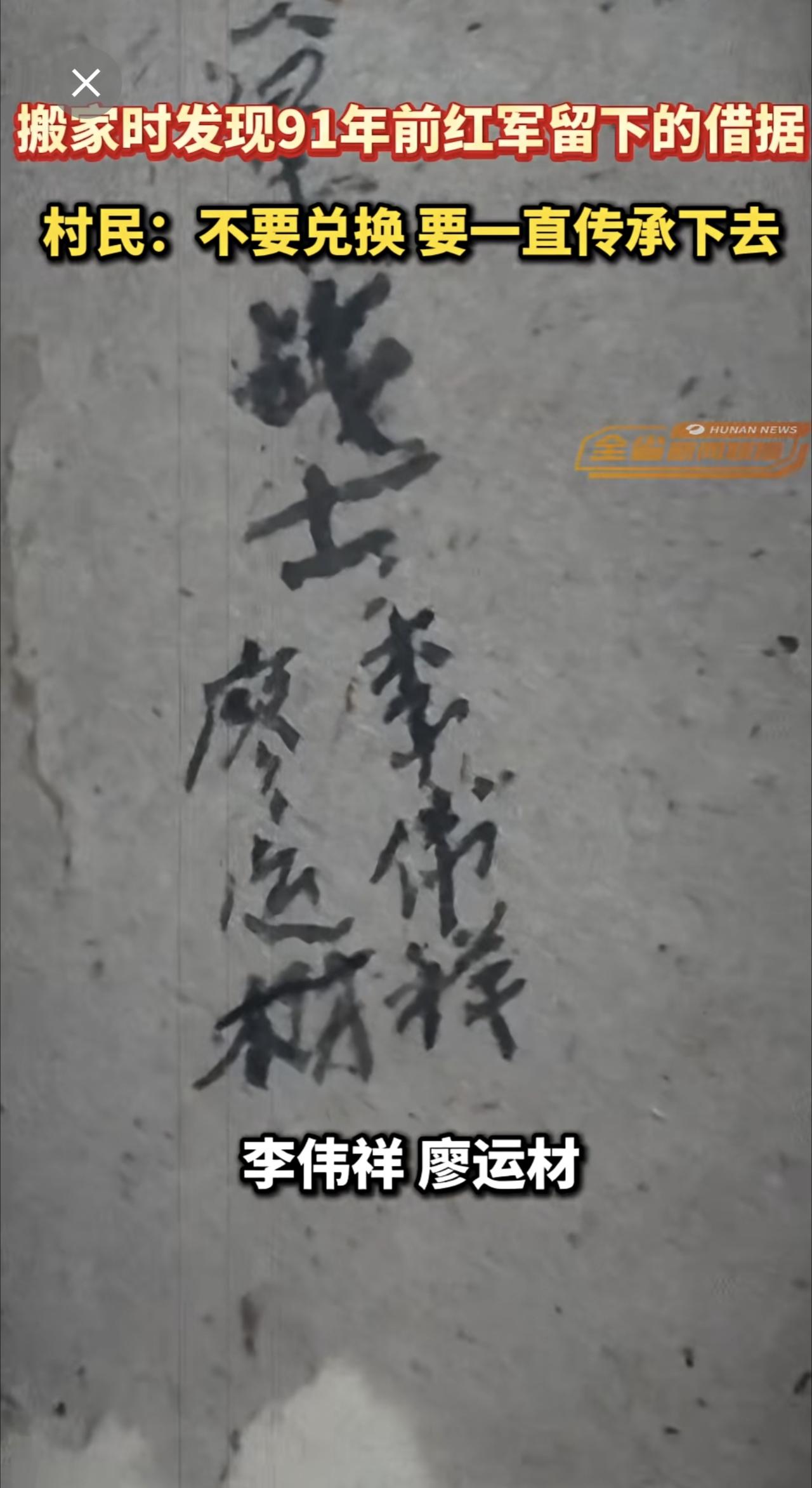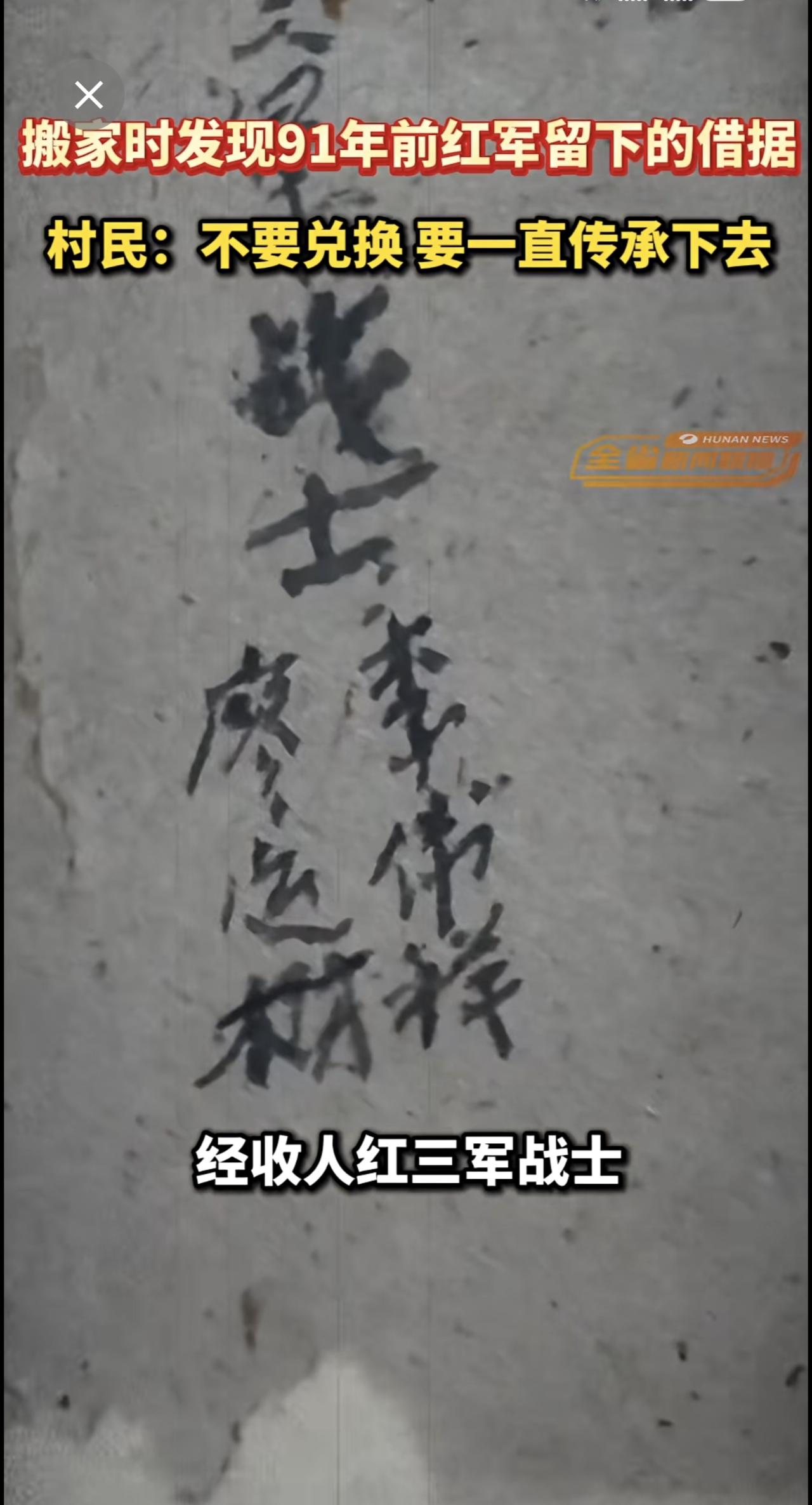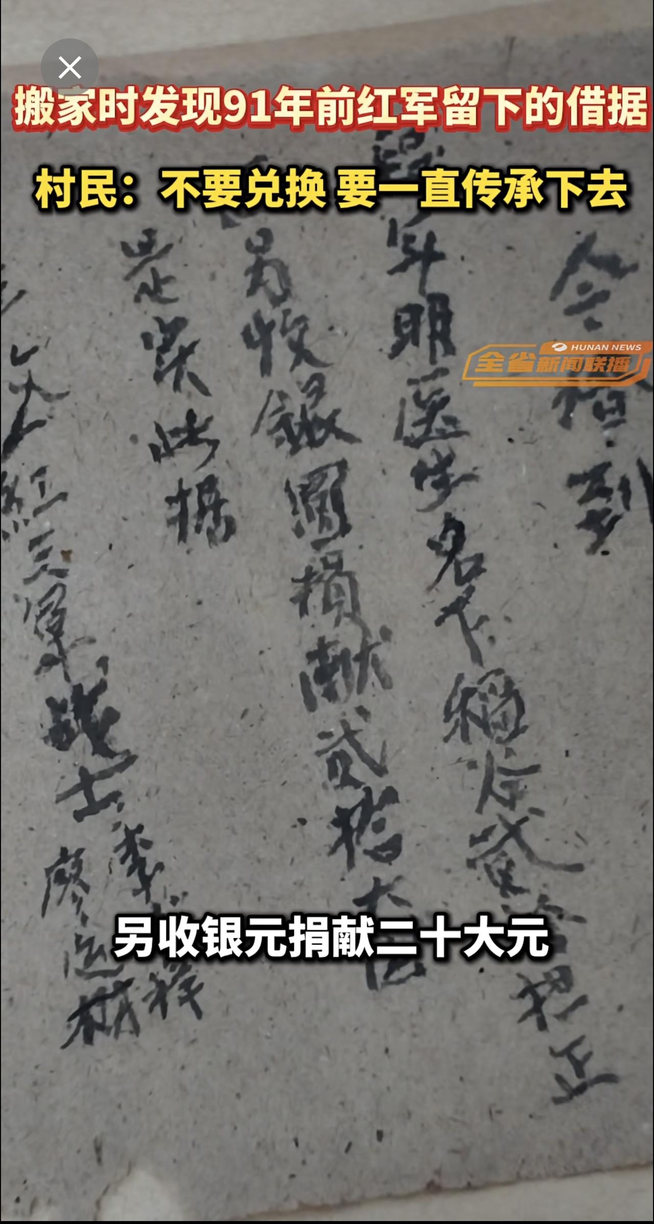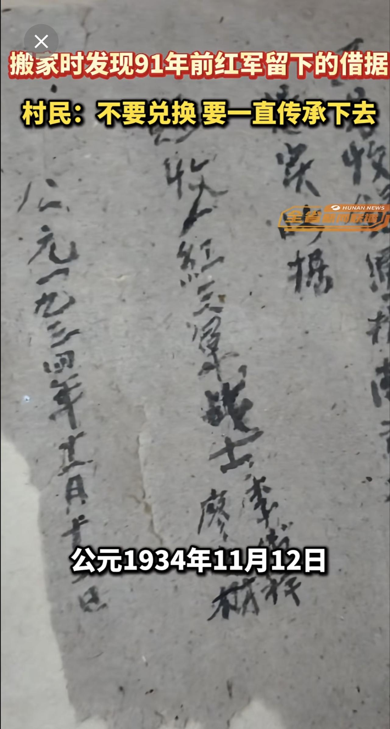 湖南郴州一村民搬家时发现91年前红军留下的借据,村民:不要兑换,要一直传承下去。