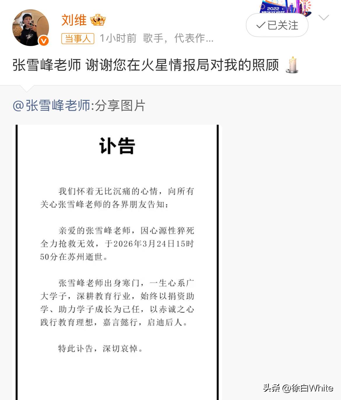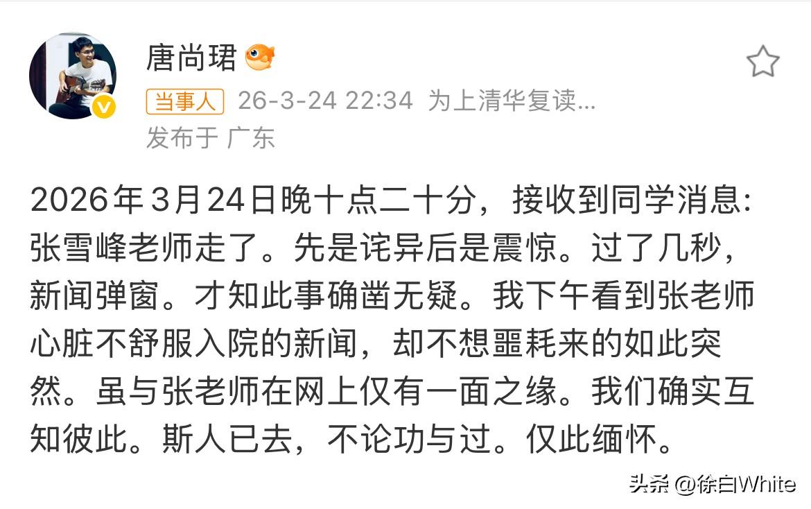 3月25日,胡锡进,刘维,唐尚珺发文悼念张雪峰!唏嘘,难过,感激,百感交集! 张雪峰骤然离世,令行业内外均为之动容! 胡锡进对于张雪峰骤逝表示震惊,难过,感叹他是一个生动有趣的灵魂! 刘维在线感谢张雪峰当初在节目中的照顾! 唐尚珺,虽只有线上一面之缘,却互知彼此,过往不论功过,仅此缅怀! 网友对于张雪峰的骤逝表示遗憾,再也听不到他的单口相声了,说到这个,想起了刚认识张雪峰时,他的单口相声,吸引了无数人