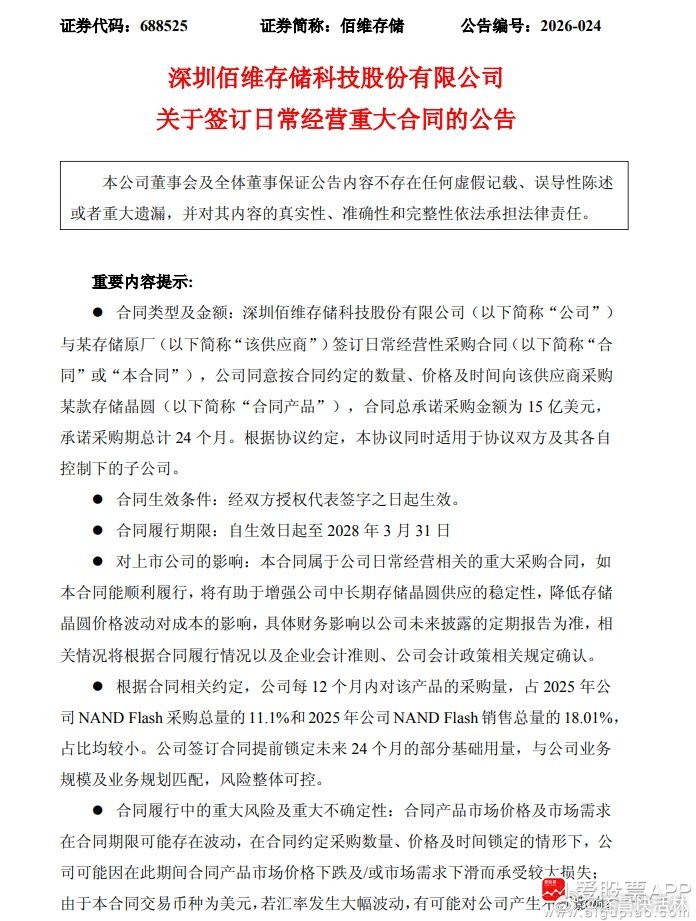 688525 佰维存储公告,公司与某存储原厂签订日常经营性采购合同,公司同意按合同约定的数量、价格及时间向该供应商采购某款存储晶圆,合同总承诺采购金额为15亿美元,承诺采购期总计24个月。合同自双方授权代表签字之日起生效,履行期限自生效日起至2028年3月31日。