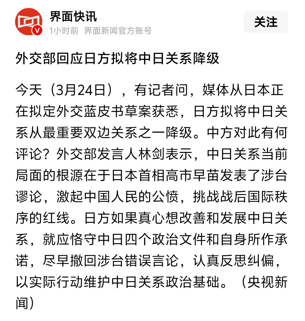 看到这个消息,我的第一反应不是愤怒,而是觉得滑稽!据央视新闻3月24日消息,日本准备将中日关系从最重要双边关系之一降级!众所周知,中日走到今天这个地步,一切责任都在日方;可日方不但不反思不改正,反正试图“倒打一耙”,太滑稽了吧!看来他们准备“一条道走到黑”了,那就拭目以待吧!