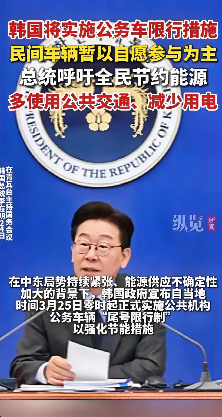 就在刚刚,韩国宣布了 3月24日,韩国政府正式宣布,从25号零点起,所有公家单位的公务车要按车牌尾号限行。这是为了省油,因为中东地区局势再度紧张,全球能源供应面临潜在风险。 这是韩国时隔15年重启公务车限行,上一次还是2011年油价破百美元之时,足见当前能源警报已经拉响到危险级别。 限行规则清晰明确,周一限1、6,周二限2、7,周三限3、8,周四限4、9,周五限5、0,新能源车与应急车辆不在限制范围内。 韩国超八成原油依赖进口,其中近六成途经霍尔木兹海峡,中东战火一起,这条能源生命线随时可能被掐断,政府不敢有丝毫大意。 3月18日韩国已将能源危机预警从“关注”上调至“注意”,此次限行是配套硬措施,目的是快速压低公共部门燃油消耗。 韩国这波操作,明眼人一看就知道是被逼到了墙角。一个资源极度匮乏的国家,把国运命脉全押在一条随时可能被战火切断的海峡上,这种安全感有多脆弱,只有他们自己心里最清楚。公务车限行看着是小事,实则是整个国家能源焦虑的集中爆发,是在为可能到来的断油危机提前“勒紧裤腰带”。 对比2011年那次油价破百,如今的局势显然更凶险。当年只是价格上涨,钱能解决问题,现在是地缘冲突直接威胁运输通道,有钱都未必能买到油。韩国政府把预警级别上调,再祭出限行手段,本质上是在向民众传递一个信号:能源安全已经不是选择题,而是生存题。 韩国的能源困境,根源在于几十年不变的对外依赖结构。原油对外依存度接近百分之百,七成以上来自中东,近六成要走霍尔木兹海峡。这条全球能源大动脉一旦出问题,韩国的工业、交通、民生都会瞬间停摆。这种把鸡蛋放在一个篮子里的做法,在和平时期能降低成本,可一旦地缘政治动荡,就成了致命短板。 公务车限行只是第一步,后续大概率会有更严厉的措施。韩国政府已经释放战略石油储备,提高核电利用率,甚至考虑对民间车辆实施限行。这些动作看似积极,实则都是被动应对,治标不治本。真正的问题在于,韩国始终没能摆脱对化石能源的过度依赖,没能建立起多元化、抗风险的能源体系。 反观全球,能源格局早已进入动荡期。中东冲突持续升级,油价飙升,各国都在重新审视能源安全。欧洲加速推进可再生能源,美国加大本土油气开采,中国则在新能源领域全面发力。而韩国,除了被动应对危机,似乎还没找到真正的破局之路,只能在别人的博弈中被动挨打。 更值得深思的是,韩国的焦虑正在向整个东亚传导。作为制造业大国,能源价格上涨会直接推高生产成本,挤压企业利润,影响出口竞争力。韩国汽车、电子、化工等支柱产业,都将面临巨大压力,这不仅是韩国的问题,更是整个区域产业链的考验。 这场能源危机,也给所有资源匮乏的国家敲响了警钟。过度依赖单一能源通道,迟早会被地缘政治牵着鼻子走。唯有加快能源结构转型,发展可再生能源,构建多元化供应体系,才能在动荡的世界中掌握主动权。韩国的限行令,看似是省油,实则是在为过去的短视买单。 各位读者你们怎么看?欢迎在评论区讨论。韩国政策解读 尾号禁限禁限号