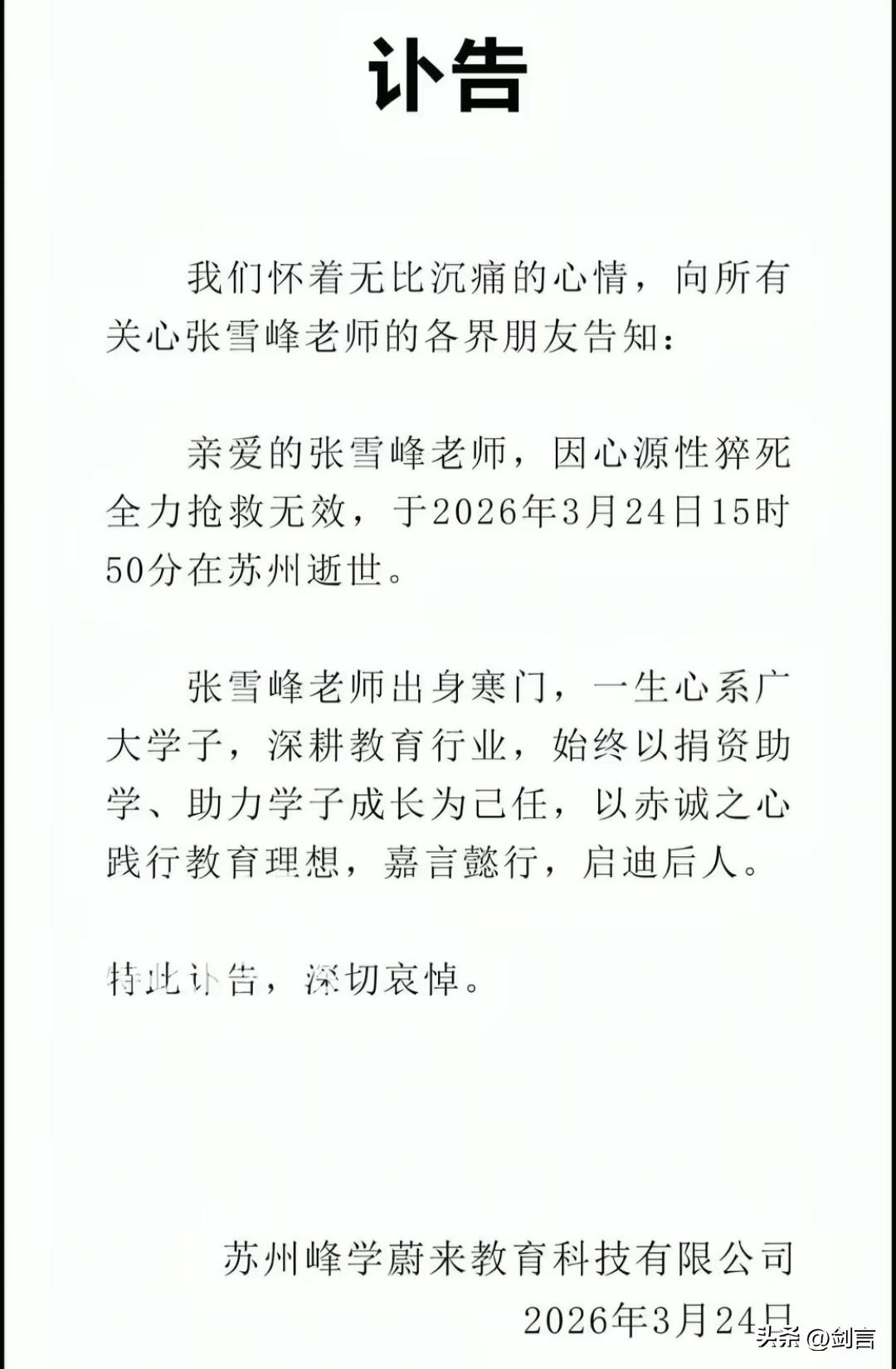 实在是不敢相信。 那个知名的教育博主张雪峰离开了这个世界。 因为心源性猝死,才41岁的他永远的离开了。 这是教育界的一大损失。 他为这个世界留下了什么呢? 我从他以往的直播中知道,他帮助了很多学子为他们指明了报考方向。也知道他作为一个老板对自己的员工很好。 一路走好!张雪峰老师!