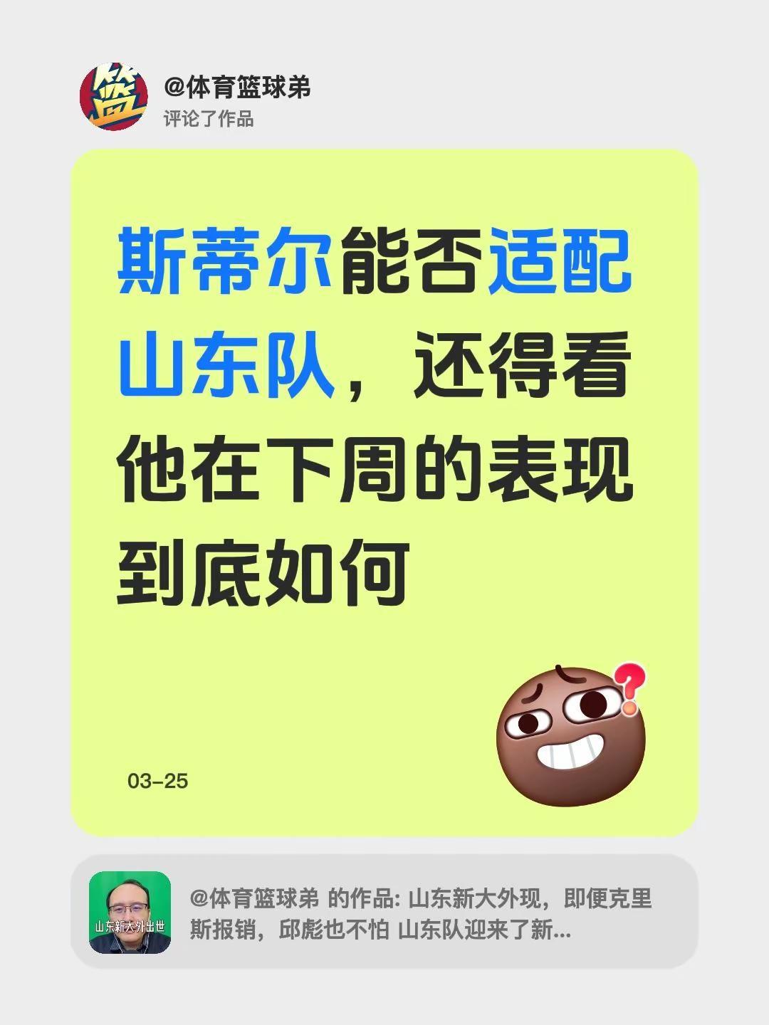 我评论了@体育篮球弟 的作品:斯蒂尔能否适配山东队,还得看他在下周的表现到底如何
