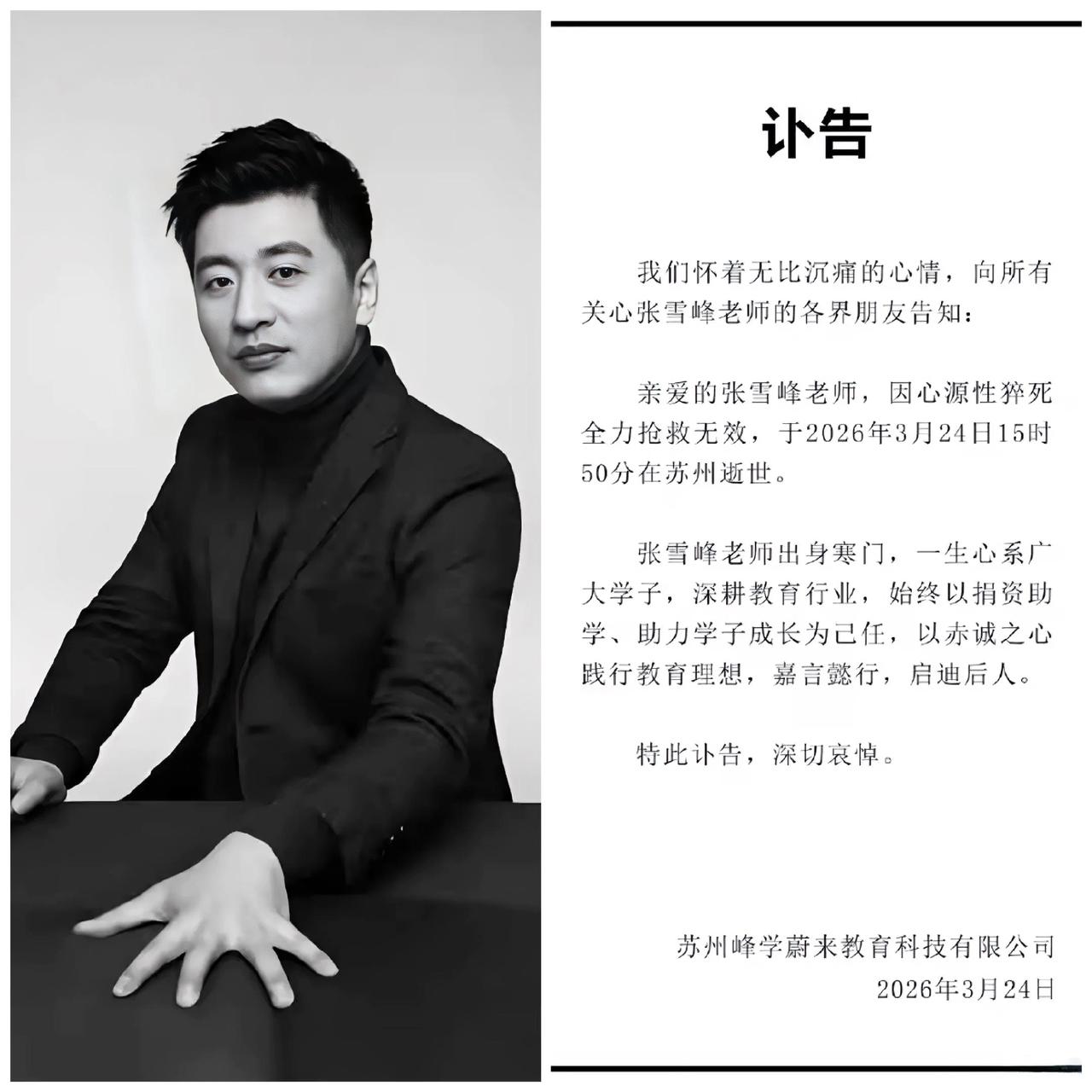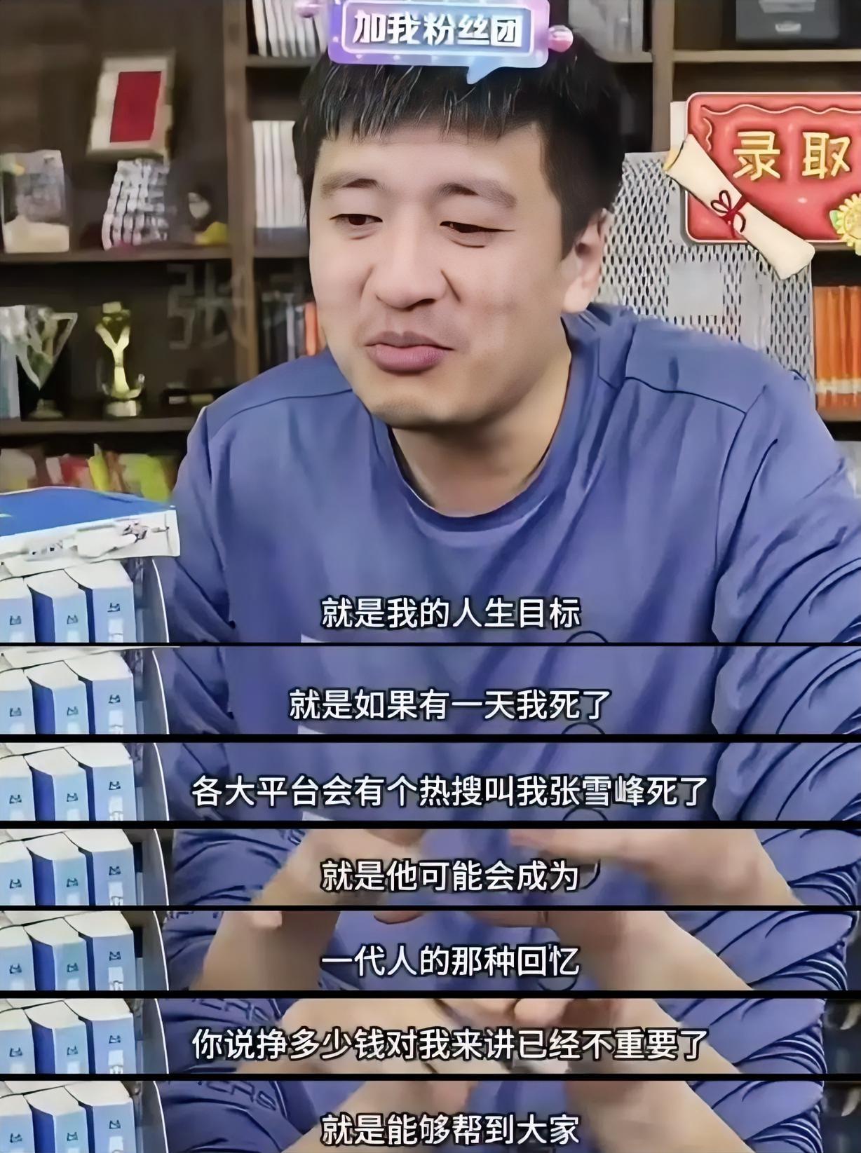一觉醒来,张雪峰没了、走了、去世了。 现在真的如他希望的那样,成为某些人的时代记忆。 作为一个4000万粉丝网红,能做到一年营收8个亿,是一个成功的人物。 留下了新闻学“打晕论”、文科“贬低论”、医学“劝退论”等争议观点,是一个清醒的人物。 年入3亿,名下没买房、也不会开车,在苏州也是租房居住,是一个固执的人物。 曾经公开谈论自己的死亡,“希望成为一代人的回忆”,真是人生不知道“意外与明天谁会先来?”,是一个洒脱的人物。 心源性猝死,“高强度的工作+高强度的运动”真是一个锋利的心脏杀手组合。 其实没法评价他对社会的价值和贡献,但不可否认,他用“接地气的真话”,把一些复杂的规则讲给普通人(特别是普通考生)听,让某些信息不再被垄断,为很多的考生指明的人生的道路。