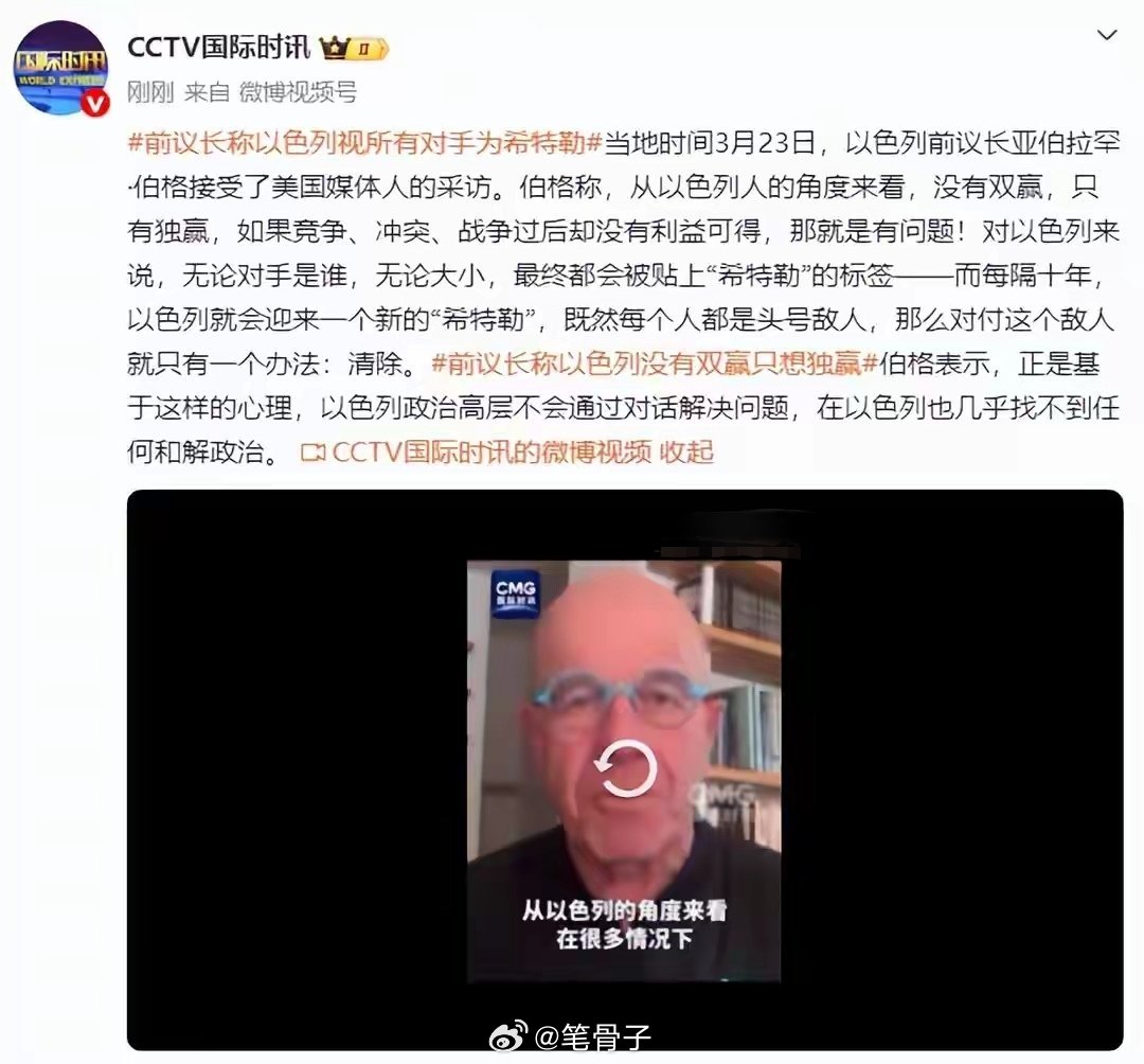 伯格这番话算是彻底摊牌了:在这种心态下,以色列高层根本不想通过对话解决问题,国内也几乎不存在“和解”这回事。说白了,这就是认定了只有拳头硬才是硬道理,谁挡路就消灭谁,根本没打算留活路。 专栏 · 中美博弈|俄美博弈|中俄联手|寰球动态