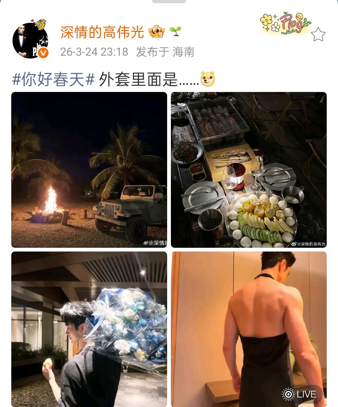 高光伟在深夜更新动态,带来一份惊喜,配文“外套里面是……”,还附上一个柴犬表情包。 高光伟这条动态仿佛在分享春日里的一段户外生活场景,文案还故意卖了个小关子,瞬间勾起大家对“外套里面”内容的好奇。你想猜猜外套里面可能是什么吗? 点开高光伟的动态,映入眼帘的是一张有些辣眼睛的图片,他穿的是一件黑色吊带式服装,露出结实的背部肌肉。这种服装风格颇为独特,露出背部和手臂,看上去简约又带些个性设计感。 网友纷纷留言:“哎哟喂,几年了这福利我头回见哈哈哈”“哥哥晚餐,已经是秀色可餐了,这还让人睡觉不[爱慕]” 你好奇正面是什么样的吗?