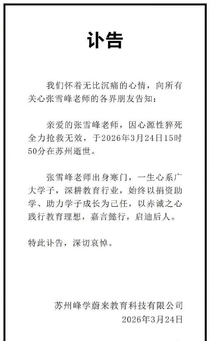 太突然!张雪峰突发心源性猝死离世,年仅41岁,全网破防 谁也没想到,3月24日深夜,张雪峰公司正式发布讣告,这位陪伴无数家长和考生的老师,因心源性猝死抢救无效,于当天15:50在苏州逝世,才41岁。 消息一出,全网瞬间炸了。前几天还能看到他奔波讲课、熬夜直播,为普通家庭孩子填志愿、选专业、避坑,说话直来直去,句句接地气,帮无数人少走弯路。他出身普通,却一直想着帮寒门学子打破信息差,这份真心,大家都记在心里。 知情人透露,他是在公司跑步后突发不适,送医没能救回来。长期高强度工作、连轴转巡讲、熬夜答疑,早就透支了身体,之前就因劳累住过院,可总说“孩子的前途耽误不起”,硬扛着往前冲。 有人说他犀利,有人说他实在,但不可否认,他是很多家长心中的“定心丸”,是学生眼里的实在人。一条讣告,定格了他短暂又热烈的一生,太让人心疼。 生命真的比什么都重要,再拼事业,也别拿健康赌明天。熬夜、高压、过度劳累,真的会拖垮一个人。 一路走好,张雪峰老师。 你曾经被他的哪句话点醒过?平时会不会也经常熬夜透支身体?评论区聊聊。 张雪峰去世 张雪峰讣告 心源性猝死 健康比赚钱重要