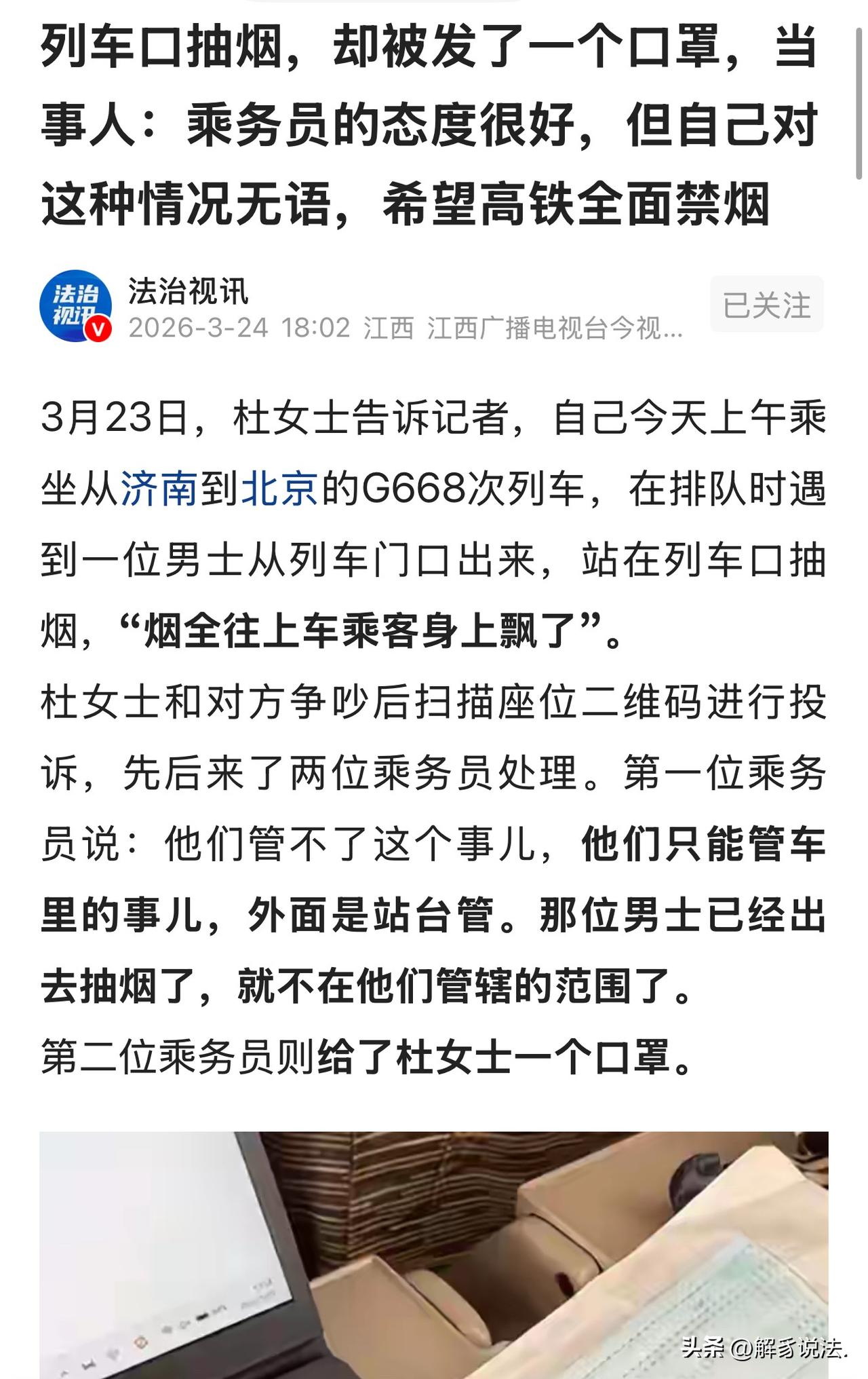 “这样的人不适合出门!”济南,女子乘高铁出门,在站台上遇见一男子当众吸烟,引来周围人群反感,女子上前制止,男子油盐不进,依旧我行我素。女子一气之下,找来乘务员,第一位乘务员以“只管车里的事儿,外面是站台管”为由,未对男子进行约束。让女子崩溃的是,第二位乘务员给自己发了一个口罩。事后,女子把此事发布到网上,希望高铁全面禁烟!网友:我不抽烟,而且很讨厌烟味,但是旅客在站台抽烟是自由吧,不喜欢可以离远一点! 3月23日上午,杜女士打算乘坐从济南开往北京的G668次高铁出行,早早收拾好东西赶到车站,顺利检票后,便跟着其他乘客一起在站台排队,准备上车出发。 当时站台上人流量不小,不少乘客拖着行李箱、背着包有序排队等候,大家都挨着列车门口站着,就等着发车时间到了依次上车。 站台空间不算特别宽敞,风也不大,空气流通性一般,周围都是等候乘车的人,整体氛围比较拥挤,大家都安安静静等着,没什么嘈杂的动静。 就在排队的时候,杜女士突然闻到一股刺鼻的烟味,顺着烟味一看,发现一名男子从列车门口走出来,直接站在列车入口旁抽烟。 男子手里夹着香烟,一口口抽着,吐出的烟雾没地方散,全都顺着风往排队上车的乘客身上飘,站在附近的杜女士首当其冲,烟味呛得她很不舒服。 杜女士本身就反感在人群密集的地方抽烟,看着烟雾飘到自己和其他乘客身上,心里顿时满是反感,周围不少乘客也皱起了眉,显然也被这二手烟影响到了,可大家大多只是避让,没人主动上前制止。 杜女士实在忍不了,上前劝说男子不要在公共场合抽烟。 可没想到,对方油盐不进,根本不听劝,依旧我行我素。 还说杜女士太矫情了,没资格对自己指手画脚,接着双方吵了起来。 杜女士气炸了,怎么会遇到这么没素质的人,这种人必须得人治。 于是,拿出手机,扫描了座位上的二维码进行投诉,希望乘务员过来主持公道。 很快,就有一位乘务员来到了现场。 杜女士立刻说明情况,可乘务员表示,他们只能管理列车车厢内的事情,站台区域不归列车乘务员管辖,是站台工作人员负责,男子已经走到列车外抽烟,不在他们的管辖范围里,他们也管不了。 杜女士心里很不是滋味,没过多久,第二位乘务员也过来了解情况。 让杜女士崩溃的是,这位乘务员没去制止吸烟的男子,而是递给了自己一个口罩。 杜女士很生气,虽然两位乘务员的态度都很不错,没有丝毫不耐烦,但她心里依旧觉得特别无语,也很委屈。 自己明明是维护公共环境,投诉吸烟的不文明行为,最后却只得到一个口罩来挡烟味,问题根本没得到解决。 事后,她一直对此事耿耿于怀,于是,将此事发布到网上,让网友给评评理。 同时她呼吁:以后高铁和火车站能像机场一样,安检的时候就没收打火机,实现全面禁烟,让乘客能在没有二手烟的环境里安心乘车。 此事曝光后,网友给出不同说法: 停车,在站台上抽烟,很正常,不喜欢闻烟味,可以走开,互相理解。 我对香水也很讨厌,以后在车上或街上也禁止女人擦香水,行不行? 这位女士要这么说的话,去烟草,叫他们停止生产,禁止销售,源头杜绝! 己所不欲勿施于人,在没有禁止抽烟的地方,抽烟的人有抽烟的权力,你不能因为你不抽烟就阻止别人行使自己的权力。你可以远离,但是没有权力阻止。相反如果他在禁止区抽烟,你就可以阻止他抽烟。 《公共场所卫生管理条例实施细则》第18条规定:室外公共场所设置的吸烟区不得位于行人必经的通道上。 男子在站台列车口抽烟,虽然按规定,动车组车厢内是全程禁烟的,但站台属于室外区域,目前确实没有全国统一的强制禁烟令,所以乘务员说“只管车内”,从现行规章上看也没毛病,乘务员确实没权力直接约束。 但是,高铁站台是是行人的必经通道,人挤人,谁也不想吸一口二手烟。 男子在别人劝说下就应该停止,不给别人添堵,不能因为“没犯法”,就把公共场合当成私人烟缸,还理直气壮。