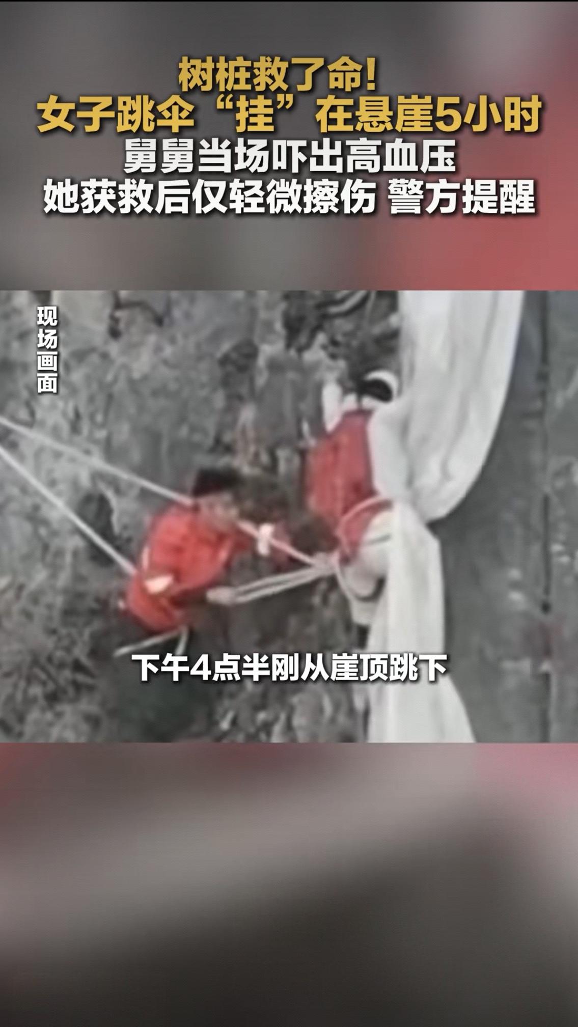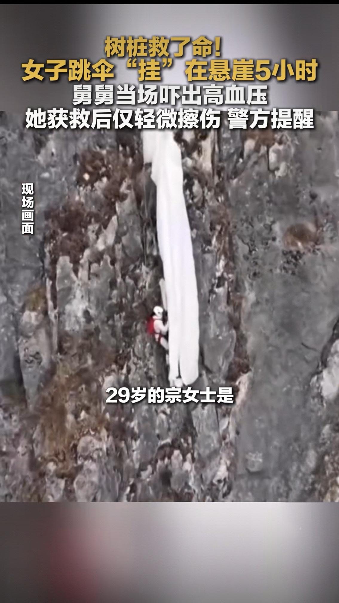 树桩救了命!女子挂悬崖5小时仅轻伤:绝境里的生之倔强,看完泪目 谁能想到,一根不起眼的树桩,竟在150米高空接住了一条命! 近日,云南昆明禄劝县“望天崖”上演惊魂一幕——拥有400次高空跳伞经验的宗女士,跳伞时突遭乱流袭击,连人带伞被吹向陡峭崖壁。降落伞先卡在石缝,转瞬脱落,她如自由落体般坠下约10米,千钧一发之际,被崖壁上一根歪扭的树桩死死挂住 。 这一挂,就是5个小时。 脚下是深不见底的深渊,崖壁湿滑无落脚处,唯有几丛杂草勉强遮身。风一吹,伞体晃动,整个人悬在半空摇摇欲坠。为了不被大风刮落,宗女士咬紧牙关,用牙齿死死咬住伞绳,手脚并用紧紧收拢降落伞,最大限度减少触风面积 。手机信号时断时续,她一边强忍恐惧,一边给家人报平安,甚至笑着安慰舅舅“只是落地有点小状况”,转头却在镜头后红了眼眶——谁能想到,这位冷静的跳伞教练,当时怕得连呼吸都不敢太用力。 舅舅在崖顶目睹这一切,急得当场吓出高血压,却只能隔着山谷一遍遍喊她的名字,每一秒都像一个世纪般漫长 。 这场救援,堪称与死神的极限博弈。雪山派出所接到报警后,迅速联合消防、护林员组建救援队,携带专业器材火速奔赴现场 。崖壁近乎垂直,无路径可达,救援难度极大。救援队启用“低空警务”,无人机全局扫描精准定位,一组在山顶搭建锚点筑牢安全通道,另一组队员身系绳索,像“蜘蛛侠”一样沿崖壁艰难攀爬 。 风大、路滑、绳卡,每一步都步步惊心。5个小时里,救援人员反复调整绳索角度,克服寒风与湿滑阻碍,一点点靠近被困的宗女士。最终,在救援人员的合力牵引下,她被安全拉回崖顶,仅受轻微擦伤和体力透支,生命体征平稳。 事后复盘,这根“救命树桩”的幸运,离不开宗女士的专业素养——400次跳伞积累的应急经验,让她在绝境中保持清醒,用最顽强的坚持撑到了救援到来。而这场救援的背后,更是多方力量的火速集结,是守护生命的默契与担当。 警方提醒,此次跳伞事前已完成报备,属于合规运动,但极限运动风险极高,气流、地形瞬息万变,哪怕是专业人士也需做好万全准备。 一根树桩,见证了绝境中的生之倔强;一场救援,彰显了生命至上的温暖底色。愿每一次勇敢都被善待,每一份热爱都有底线,敬畏自然,敬畏生命, 方能在追逐刺激时,守住平安的底线。极限运动 那些令人泪目的救援瞬间
