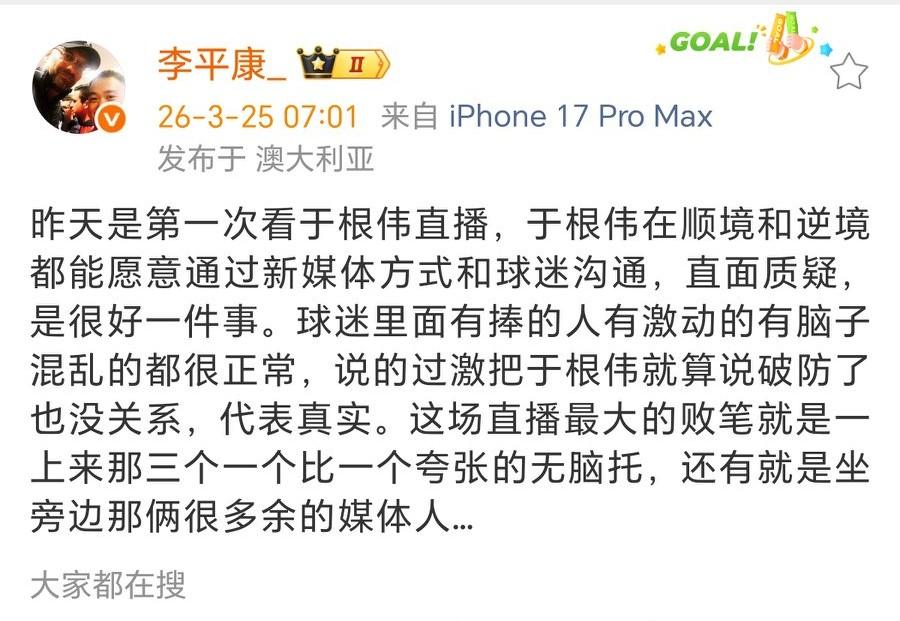 各媒体人评论于根伟直播:请托是败笔,坐在旁边的两个媒体人有些多余! 球迷期待已久的于根伟的直播,并没有得到球迷的认可,主要是天津津门虎成绩如此的糟糕的情况下,关于揽责、成绩不好的原因、用人、技战术的调整、接下来如何应对等等,都没有向球迷说明白,反而还指责一些球迷不懂球,而且更让球迷不理解的是,居然还请了几个人连线,上来对于根伟一顿吹捧。而批评于根伟的,竟然有些破防。 知名足球媒体人李平康表示:这场直播最大的败笔就是一上来那三个一个比一个夸张的无脑托,还有就是坐旁边那俩很多余的媒体人. .天津津门虎