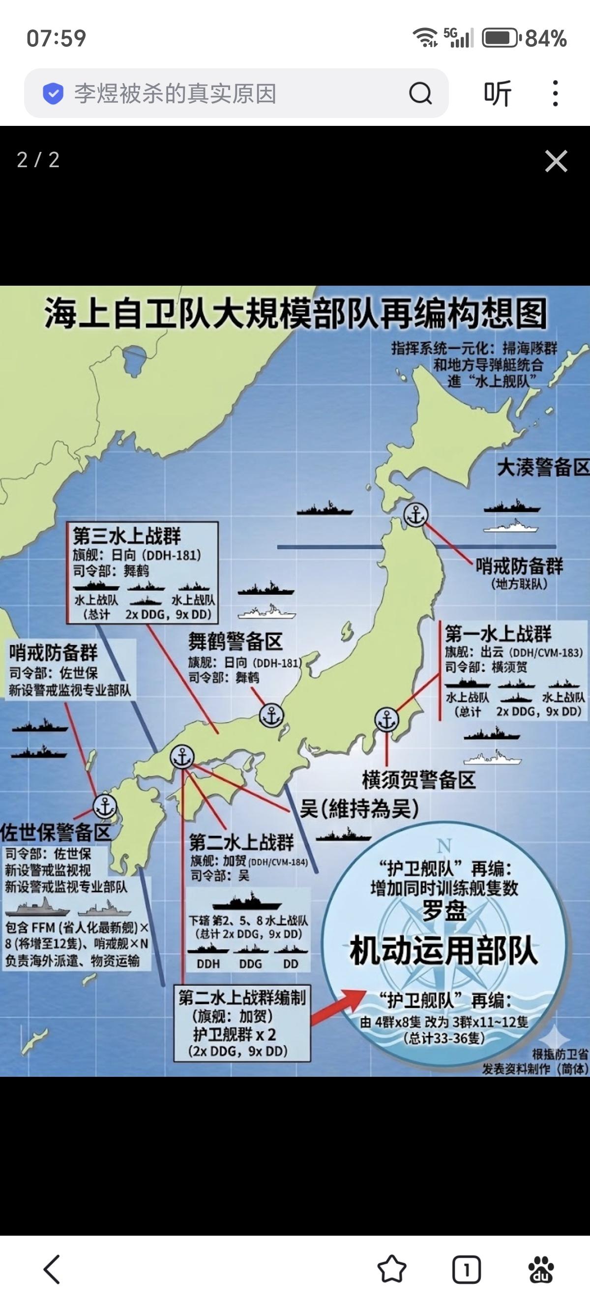 日本海上自卫队于3月23日起正式实施大规模部队改编,废止了长久以来的「护卫舰队」而以「水上舰队」取代。 新的水上舰队包含三个水上战群、水陆两栖机雷战群以及哨戒防备群,具体信息如下: 第一水上战群:司令部横须贺,旗舰出云(DDH/CVM-183) 第二水上战群:司令部吴,旗舰加贺(DDH/CVM-184) 第三水上战群:司令部舞鹤,旗舰日向(DDH-181) 以第二水上战群为例,该部队除直辖DDH/CVM之外,下辖第2水上战队、第5水上战队以及第8水上战队包含2艘DDG以及9艘DD。 此外新编的水陆两栖机雷战群司令部位于佐世保,以伊势(DDH-182)为旗舰并结合扫雷与运输舰。