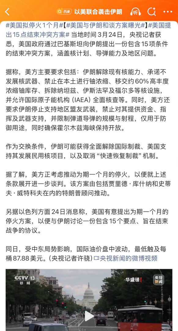 美国与伊朗和谈方案曝光美方主要要求包括:伊朗解除现有核能力、承诺不发展核武器、禁止在本土进行铀浓缩、移交约60%高丰度浓缩铀库存、拆除纳坦兹、伊斯法罕及福尔多等核设施,并允许国际原子能机构(IAEA)全面核查等。。。这要是能谈成,我都瞧不起yl
