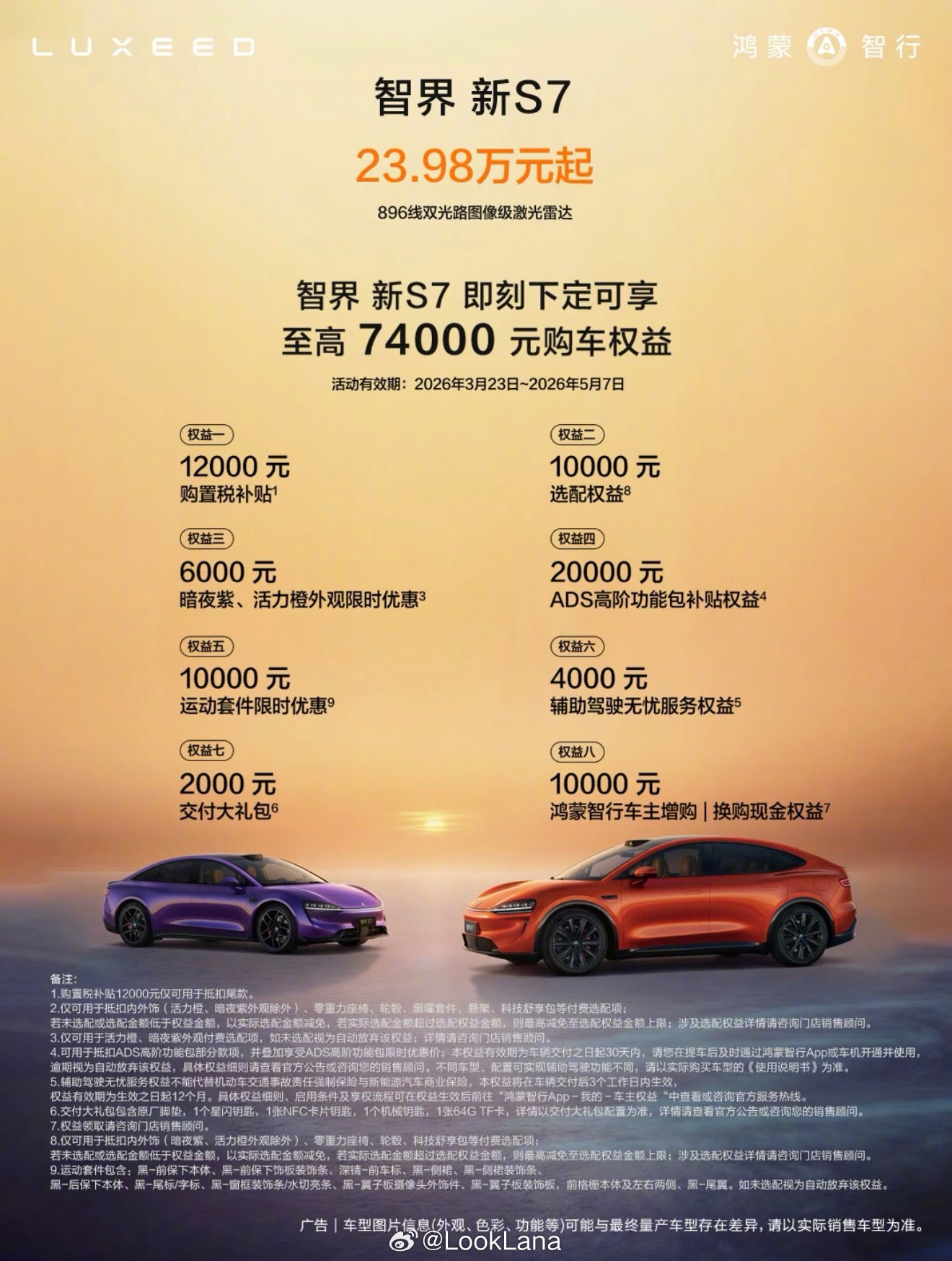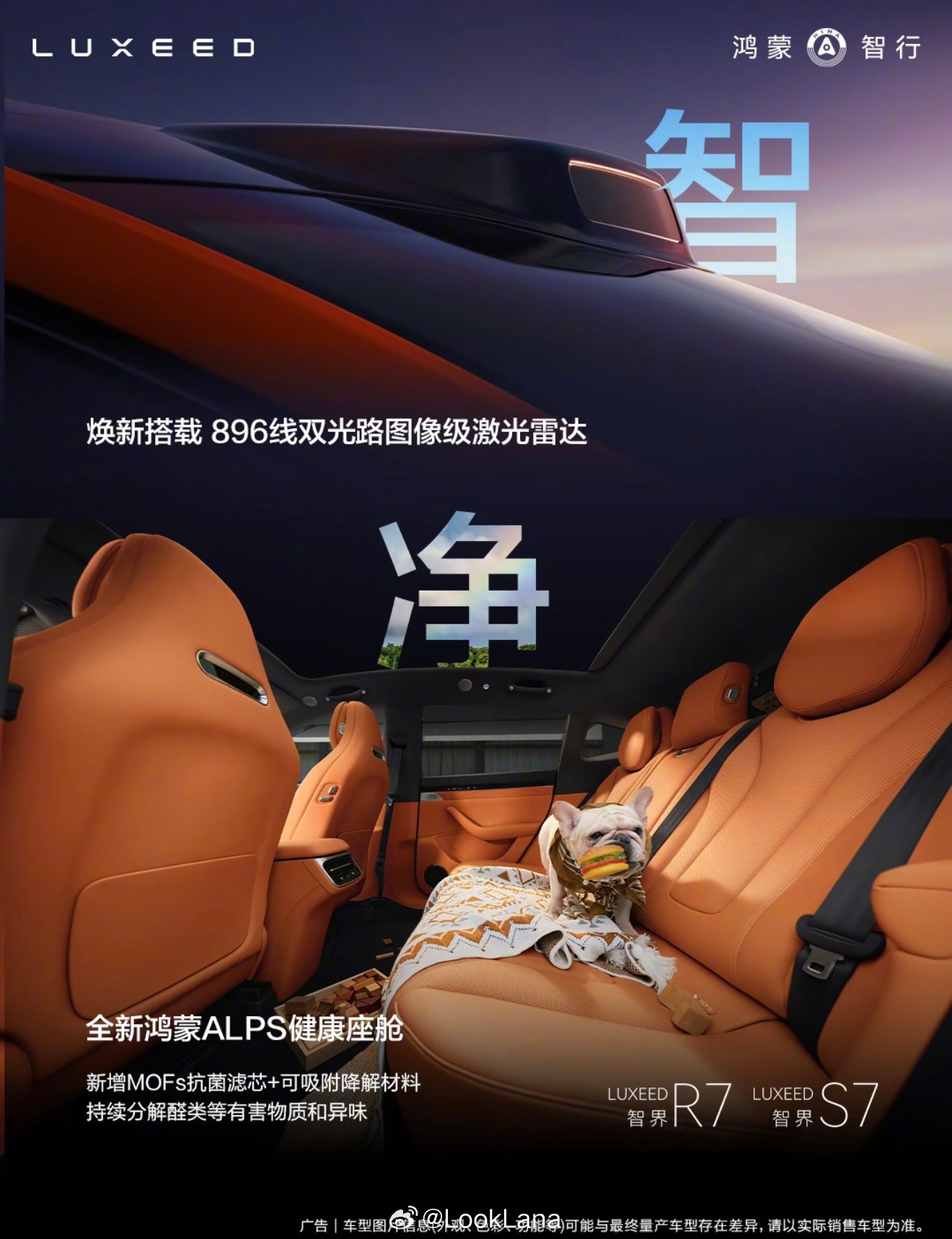 896线版智界R7发布即交付智界 这波“发布即交付”真的有点东西昨天华为发布会结束!就感觉智界新双7这次真的杀疯了🔥全新暗夜紫&活力橙车色鲜活登场,新增赤茶橘内饰配色,看着就很高级,价格也真香💰新S7 23.98w起,R7 25.98w起,现在下定还有至高1.2w购置税补贴,这波性价比直接拿捏!