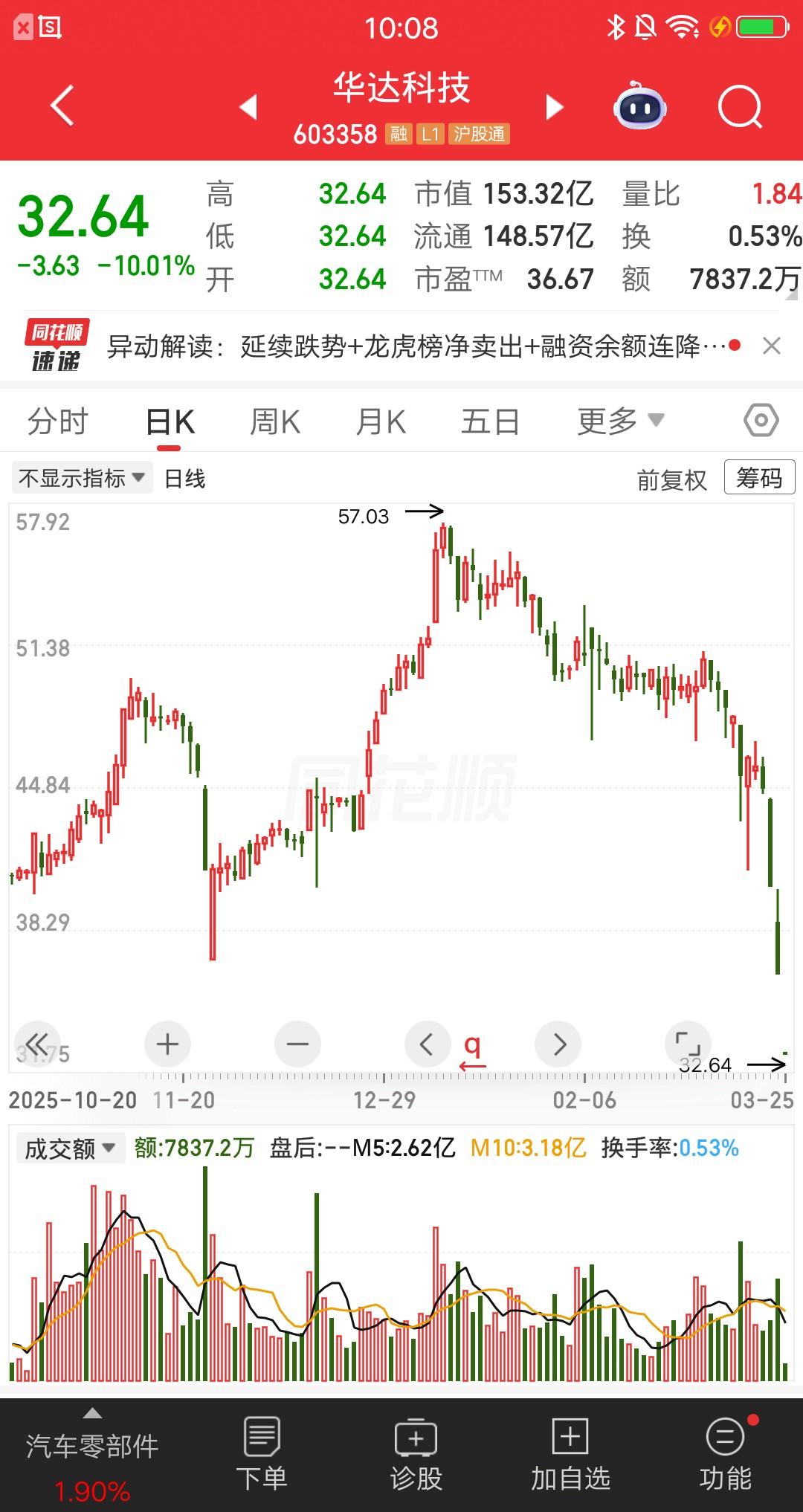 A股今天最惨的票诞生了,是仅有的一只跌停股,别的票都在反弹,就它封死跌停。谁要是倒霉买了它,要么是运气太差了,要么就是水平太差。 该票集合竞价一字跌停,股价纹丝不动的焊在地板上。仅仅成交了7800多万,板上还有5.57亿资金在排队割肉。再看日线图,连续三个跌停板了。让人费解的是,该票并没有利空,也不知道为何杀跌,被埋的资金一头雾水。 股价崩盘前买的人是最惨的,三天大亏30个点,那些热门龙头股跌下来也不过如此。如果选择加仓降本的话,只会亏更多。 该票是汽车零部件板块,主营乘用车车身冲压焊接零部件与模具研发生产,同时布局新能源汽车电池箱托盘、电机轴/壳及储能箱体业务,客户覆盖大众、本田等传统车企与特斯拉、理想、宁德时代等新能源厂商,正加速向新能源转型。 有没有高手知道为啥跌这么狠,公司的2025年报还没发,可别暴雷呀。