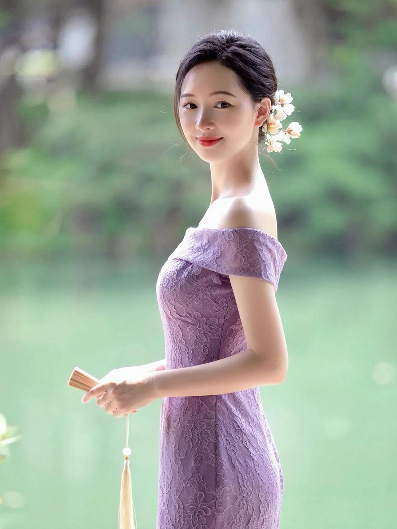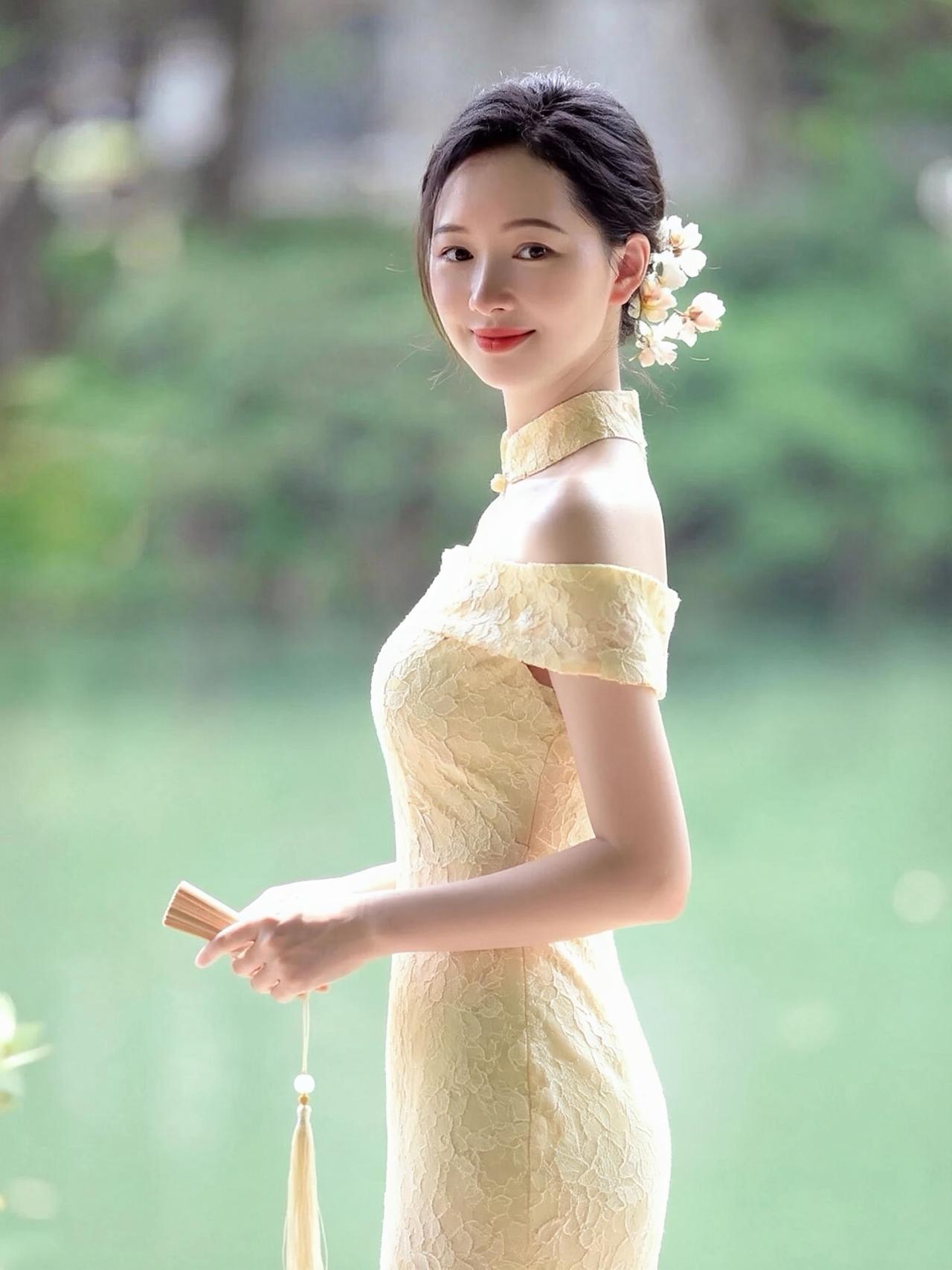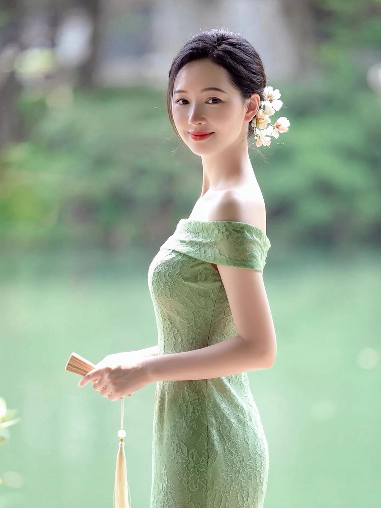 这组照片中的女子,宛如江南烟雨中走出的古典佳人,温婉雅致,气质绝尘。 她身姿窈窕,肌肤白皙,眉眼间带着江南女子特有的温婉柔情,红唇浅笑,韵味十足。乌黑秀发盘起,鬓边簪着素雅的白色小花,简约又精致,尽显东方古典美。 背景是绿意朦胧的湖畔,水光潋滟,绿意葱茏,营造出静谧雅致的氛围。她身着多款不同色系的蕾丝一字肩修身裙,每一款都勾勒出曼妙身姿,尽显优雅: 白色蕾丝裙:纯净素雅,仙气飘飘,宛如月下仙子。 薄荷绿蕾丝裙:清新淡雅,如春日新芽,灵动脱俗。 浅蓝蕾丝裙:温柔静谧,似湖水般澄澈,温婉动人。 鹅黄蕾丝裙:明媚温婉,搭配立领设计,更添端庄。 嫩绿蕾丝裙:清新自然,充满生机,元气满满。 淡紫蕾丝裙:浪漫优雅,自带温柔滤镜,风情万种。 她手持一柄流苏折扇,侧身而立,姿态优雅,在朦胧绿意的映衬下,将东方女性的温婉、柔美与优雅展现得淋漓尽致,每一帧都美得如画。