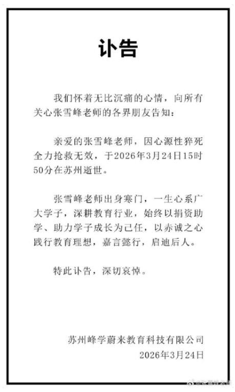 昨晚大冰的直播间,弹幕都在说张雪峰老师去世了,没多久大冰就接到消息,大冰回复的语音是这样说的,我下午的时候就知道了,所以连麦工作以前,特地点了香,大冰神情忧郁,但并没有影响工作。 其实这些年,陆续离去的名人不少,或多或少有些许感触,比如吴孟达,比如周海媚,但都没有张雪峰给我的感触那么大 像吴孟达、周海媚那些明星,我们知道他们,也喜欢他们的作品,但说到底,他们就是屏幕里的人,我们只见过他们演的角色,根本不了解真实的他们是什么样。 可张雪峰不一样,他每天直播,跟大家唠嗑、解答难题,他的声音、他说话的劲儿,甚至有时候直播累了的样子,我们都能清清楚楚看到,就跟身边一个能帮上忙的长辈似的,不是什么高高在上的名人,就是个实实在在、能接触到的人。 才42岁啊,正是干事业、顾家庭的好时候,张雪峰从东北一个小地方的普通学生,一点点打拼,到有上千万粉丝,成了大家都知道的教育名师,还开了好几家公司,算是混得相当成功了。 他最厉害的地方,就是能把那些绕人的志愿填报、考研规划,说得明明白白、接地气,不用那些专业术语,普通人一听就懂,帮好多家庭解决了升学的大难题。 他有钱、有名气,这辈子挣的钱、闯下的名头,是咱们普通人几辈子都达不到的,可就算这样,在突然的死亡面前,啥用都没有。 官方已经说了,他是心源性猝死,说白了就是累的、身体扛不住了。出事那天早上,他还在直播跟大家互动,中午去跑步,跑着跑着就不行了,没几个小时,人就没了。 这也不是偶然,早在2023年,他就因为太累被医院强制住院休养,那年3月份,他还打卡跑了72公里,看着是在锻炼,其实就是高压工作间隙,硬挤时间补身体,到最后,还是没扛住。 更让人戳心的是,张雪峰的情况,其实就是咱们很多普通人的缩影。中年人就不用说了,上有老要养,下有小要供,职场上还要跟人竞争,不敢停、不敢病,生怕一停下来,家里就没了依靠。 张雪峰就算已经有钱有地位了,照样停不下来,他身后有整个团队要养,还有那么多信任他、等着他答疑的人,他不敢歇,也不能歇。这种“被人需要”的压力,咱们很多人都能体会到——不管挣多挣少,不管地位高低,都在拼命扛着。 我们总觉得,挣更多钱、有更大名气,就能过得更安心,可张雪峰的事告诉我们,生命太脆弱了,不管你多有钱、多有名,在健康面前,大家都一样。那些熬夜加班的晚上,那些硬扛着不休息的疲惫,那些觉得“多跑两步、多锻炼锻炼就能补回来”的自我安慰,在猝死面前,根本不堪一击。 吴孟达、周海媚没了,我们会感慨,说一个时代的记忆没了,心里会难过,但那种难过,更多是怀旧,是觉得“以后再也看不到他们的作品了”;可张雪峰没了,大家难过的是,一个每天都能看到、能帮到自己的人,突然就没了,这种难过里,更多的是恐慌,是突然意识到,原来死亡离我们这么近,近到就在身边。 他跟我们一样,每天要工作,每天会疲惫,每天也在为生活奔波,他不是什么不食人间烟火的名人,就是个跟我们一样的普通人,只是比我们更成功而已。也正因为这样,他的突然离世,才让每个人都忍不住想,万一哪天,这样的事发生在自己身上,或者发生在身边人身上,该怎么办? 老辈人常说,富贵就像草上的霜,太阳一出来就没了,生命就像西边的太阳,说落就落,张雪峰的事,就是最真实的例子。 他有那么多钱,能撑起那么大的公司,却买不来多一天的生命;他有那么大的名气,能影响那么多人的选择,却挡不住一场突发的疾病。这不是说奋斗没用,也不是说成功不好,而是想告诉大家,奋斗的前提,得是有个好身体。 没有好身体,再有钱、再有名,也享受不到;没有好身体,再大的梦想、再远的规划,也实现不了。 张雪峰一没,全网都在难过,本质上,就是大家在跟一个熟悉的陪伴者告别。这种告别,不只是舍不得,更让大家开始反思自己的生活——我们是不是也跟他一样,拼命工作,忽略了身体?是不是也总说“忙完这阵就休息”,可从来没真正休息过?是不是也把“忙”当成借口,忘了关心自己、关心身边的人? 张雪峰用他的一生,给我们上了最后一课:钱和名气,都是身外之物,早晚都会消失,只有健康的身体,还有当下的日子,才是最真实的。 我们不用非要追求多成功、多有钱,只要守住健康的底线,好好生活,好好陪伴家人,踏实过好每一天,就够了。毕竟,能平平安安、健健康康地活着,能陪着家人走完一辈子,比任何名利都重要,也比任何东西,都能经得起无常的考验。