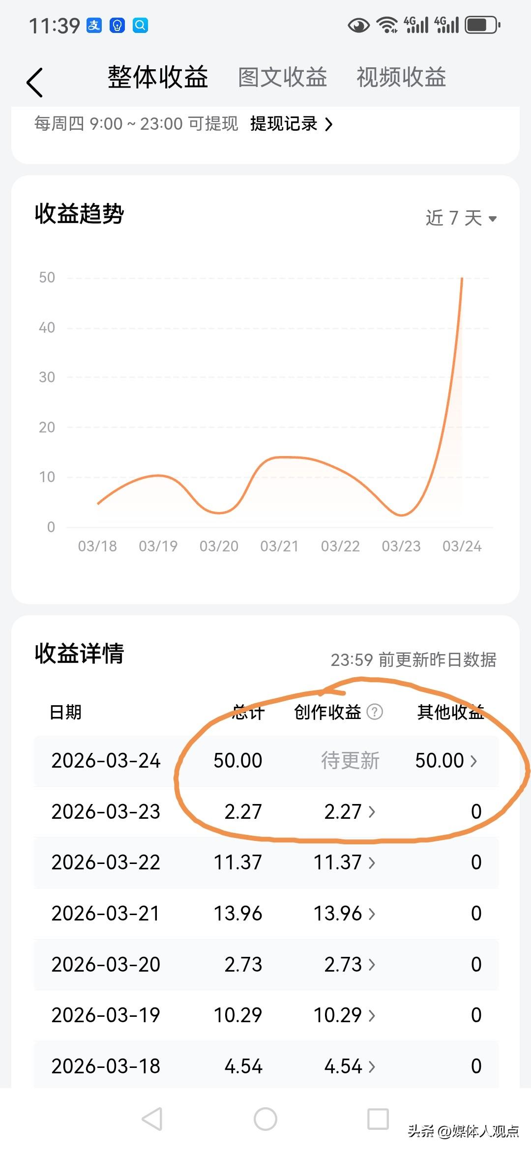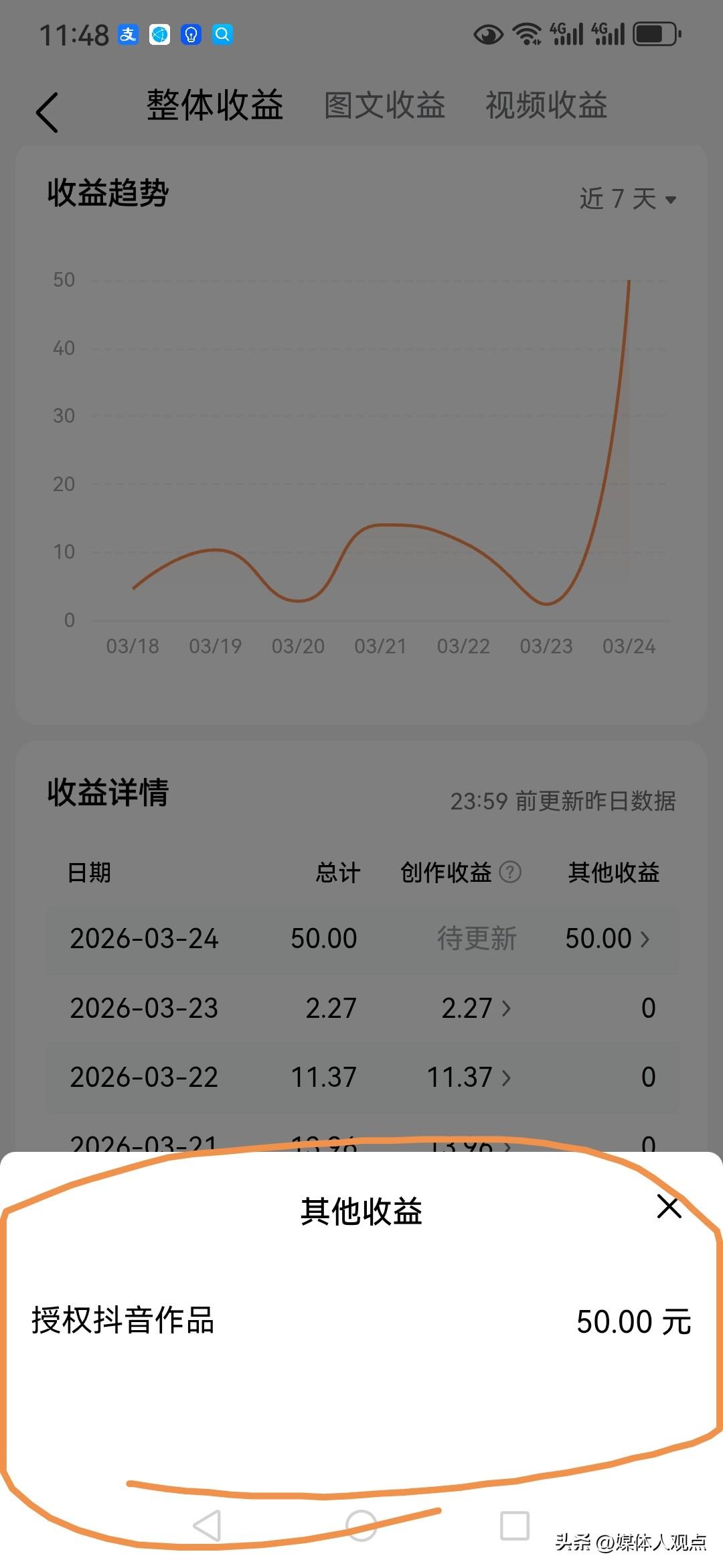 刚刚看到头条发了一个信息说感谢我参与了活动,把奖金放在我的收益里边了,我一想又是几分钱撑死几毛钱,仔细一看,哎呦,还不错,50元!可我想不起来我参加了什么活动了,给了我奖金50元,50元对每个人来说又算什么呢?可是在这我就会惊喜,就跟一个人爱打麻将是的,打了一圈赢了20块,他都会乐,他在乎这20元吗?谁也不在乎!什么场合说什么话,什么场合办什就在于此! 发完文章后又点击查看原来50元奖励的是授权抖音作品!