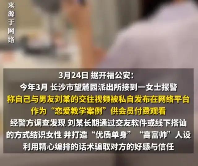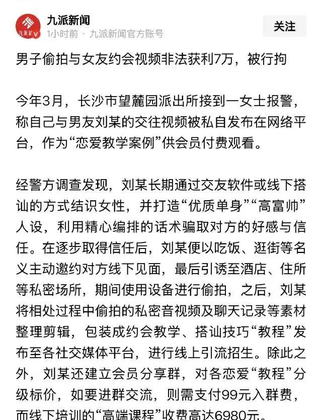 长沙,一男子约女友去酒店开房,亲密时刻偷偷拍下视频,回头将两人交往画面剪辑制作,公然打着“恋爱教学”的旗号,把女友的隐私当成给会员上课的素材。入群99元,线下课程6980元,200多名会员买单,非法获利超7万元。直到女友偶然发现,崩溃报警,这场披着恋爱外衣的肮脏骗局才彻底曝光。九派新闻3月25日报道后,全网震怒,无数网友直呼:这哪里是谈恋爱,分明是把真心当成了赚钱的工具! 很难想象,女孩满心欢喜奔赴爱情,以为遇到了托付终身的人,在最私密、最放松的时刻卸下所有防备,却不知自己早已落入精心布置的陷阱。男子从交往之初就心怀鬼胎,所谓的温柔体贴、甜言蜜语,全是为了获取信任、方便偷拍的铺垫。他把女孩的赤诚爱意,剪辑成博人眼球的低俗内容,把两个人的专属回忆,变成明码标价的敛财商品,甚至堂而皇之地开课“教学”,把伤害他人隐私当作炫耀的资本。 更让人脊背发凉的是,竟有200多人愿意为此买单。99元入群费门槛不高,6980元的线下课依旧有人趋之若鹜,这些人抱着猎奇心态围观他人隐私,看似花小钱学“恋爱技巧”,实则在纵容违法犯罪,在无形中成了伤害女孩的帮凶。他们不知道,屏幕里那些被当作“教材”的画面,是一个女孩被践踏的尊严,是一段被彻底撕碎的真心,是足以毁掉一个人一生的阴影。 女孩发现真相的那一刻,该有多绝望?曾经的浓情蜜意瞬间变成利刃,最私密的过往被公之于众,被陌生人指指点点、肆意窥探。她没有选择隐忍,而是果断报警,用法律捍卫自己的权益,这是对渣男最有力的反击,也给所有陷入爱情的人敲响了警钟。 这起事件撕开了当下婚恋市场的丑陋一角:多少人打着“恋爱教学”“情感咨询”的幌子,行着偷拍、传播隐私、违法牟利的龌龊勾当;多少人在快餐式爱情里迷失,把真心当作筹码,把隐私当作商品,毫无底线与良知。人性的贪婪与卑劣,在利益面前暴露无遗,而最让人痛心的,是无辜的女孩,成了恶念的牺牲品。 法律绝不会放过任何践踏他人隐私、非法牟利的行为,男子已被依法处理,等待他的必将是严厉的制裁。但这件事带给我们的反思,远没有结束。 在感情里,真心本就难得,信任更是易碎品。我们可以勇敢去爱,但绝不能毫无防备;可以相信美好,但必须守住底线。无论是恋爱还是交往,都要保持清醒,警惕那些过于完美的人设,留意那些不合常理的举动,保护好自己的隐私,守护好自己的尊严。 别让你的深情,被别有用心的人利用;别让你的真心,成为他人牟利的工具。也希望所有人都能明白:窥探他人隐私从来不是“教学”,传播私密画面更是违法犯罪,尊重他人,守住良知,才是做人最基本的底线。 你如何看待这种利用恋爱偷拍牟利的行为?恋爱中该如何保护自己?评论区说说你的看法。长沙一男子偷拍女友私密视频牟利 偷拍私密视频非法获利7万