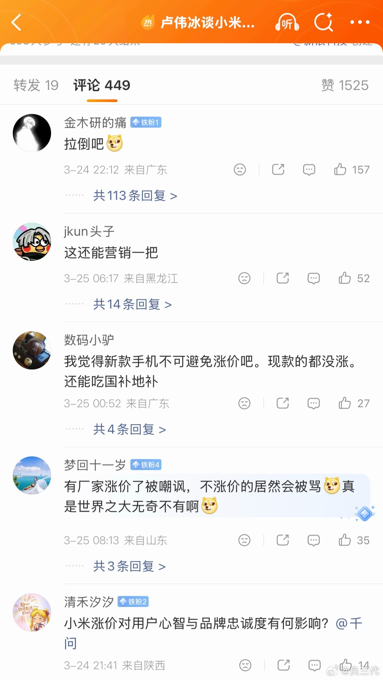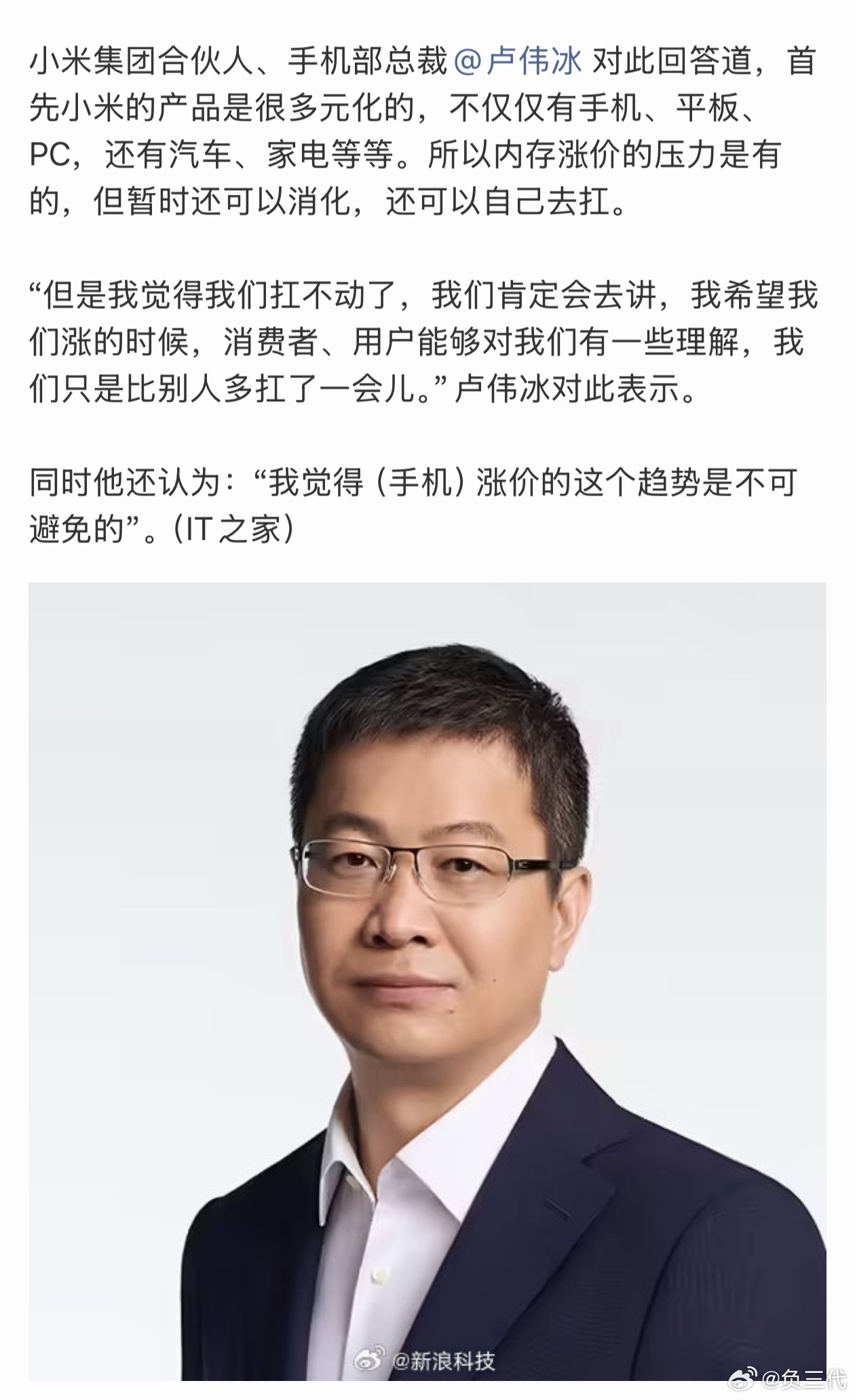 卢伟冰谈小米手机为何还不涨价小米目前确实还没有涨价,大家想买手机可以趁现在。但是后面也有可能会涨,毕竟也不能要求小米一直扛下去。大家多多理解,这有什么好骂的