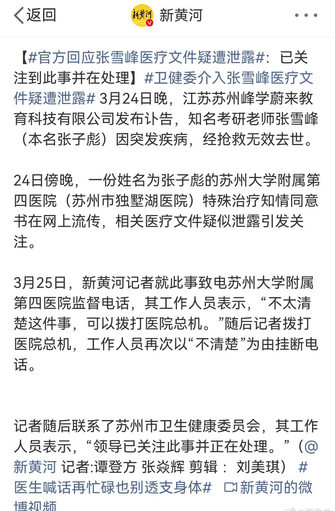 这件事必须彻查到底,究竟是谁拍摄、又是谁将照片泄露传播的。在医院就诊的普通民众,连最基本的隐私权都无法得到保障,实在让人无法接受!官方回应张雪峰医疗文件疑遭泄露