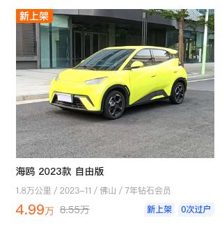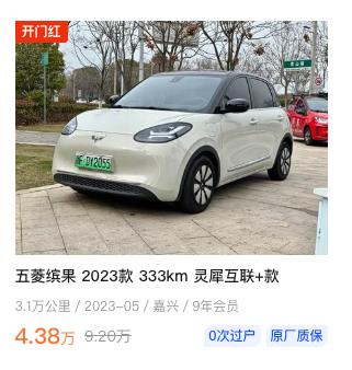如果是第一辆车,可以接受二手车,我的建议是先买个便宜的5万块以内的二手车 按照如今的油价,可以先考虑买个电车,尺寸不要太大,动力不需要很强,维修换件比较方便的,因为第一辆车也是锻炼车技的阶段,难免剐蹭,不心疼也不费钱 比如23款的五菱缤果,现在2万公里左右的,也就是4万块;比亚迪海鸥,23款的自由版,现在2万公里以内的,也就是5万左右【来自懂车帝车友圈】