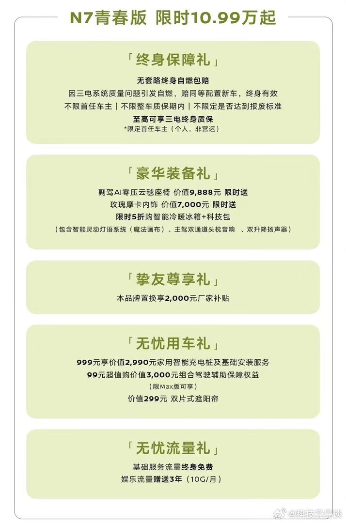这波真的赢麻了!东风日产N7青春版直接把汽车科技平权卷到新高度,彻底告别“高端科技贵价独享”的时代!首先何为科技平权?是让前沿的汽车科技走出高端圈层,打破预算门槛,让每一个消费者,都能以亲民成本,享受同等的高端科技驾乘体验。N7青春版10.99万起,用实力践行这份平权:行业首创AI零压云毯座椅重构舒适标准,全域智能防晕车技术化解出行痛点,四针刺无热蔓延电池试验筑牢安全底线,每一项都是30万+级别的硬核配置。拒绝减配、不玩套路,让普通年轻人轻松实现高端科技用车自由。这不仅是10万级纯电的一次革命,更是汽车行业向科技平权迈进的重要一步,让科技赋能出行,让美好触手可及。年轻人的不将就N7青春版刚刚好
