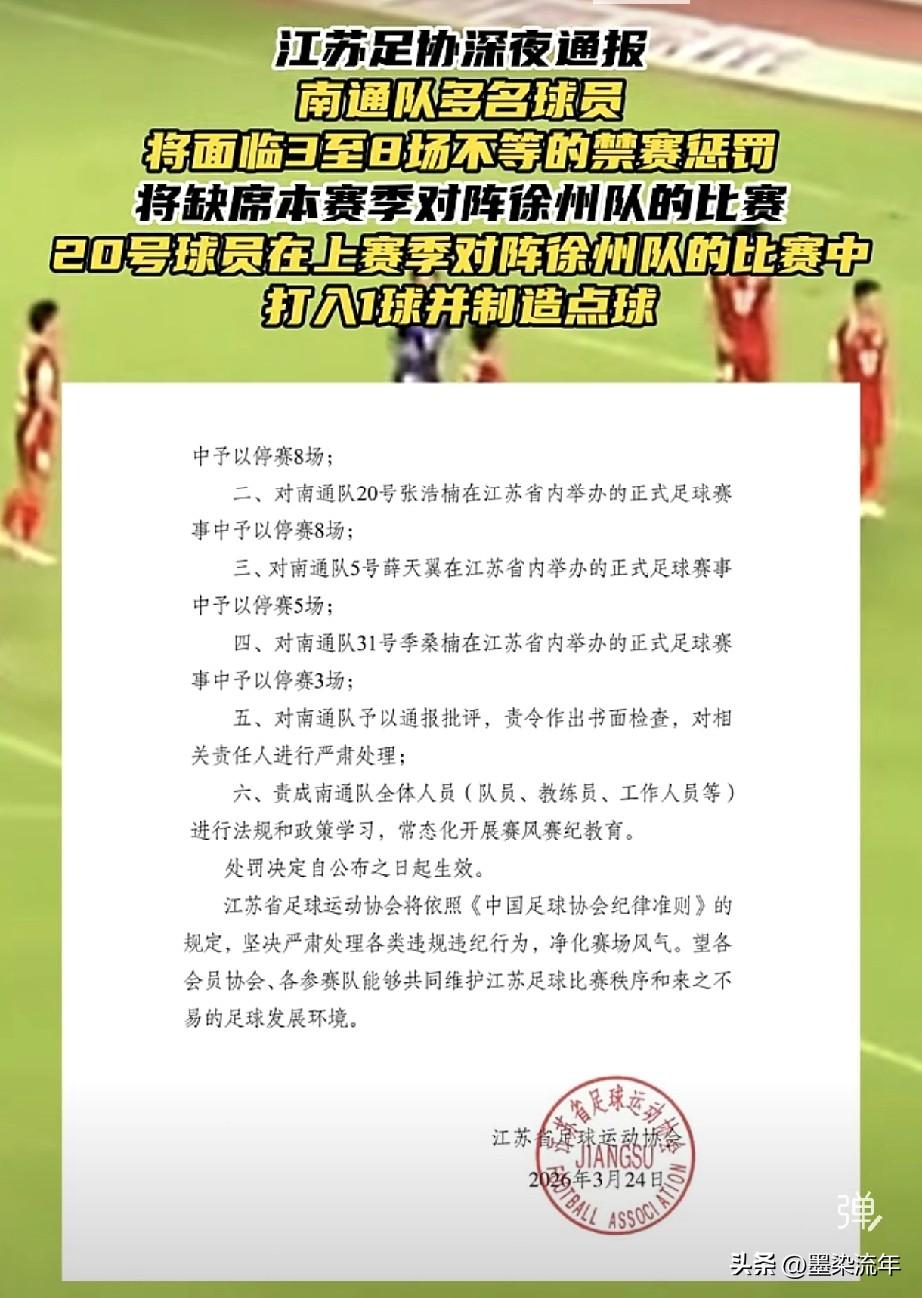 苏超新赛季还没开踢,南通队先栽了个大跟头!一场热身赛打完,多名球员直接被禁赛3到8场!就在一场和上海海港青训梯队的友谊赛里,场面直接失控,江苏足协连夜开出重磅罚单。这事儿说起来也离谱,本来就是场热身交流赛,补时阶段又因为推搡引发冲突。这下倒好,新赛季还没正式开踢,自家主力先折了大半,接下来对阵的比赛,南通队怕是要凑不齐完整阵容。