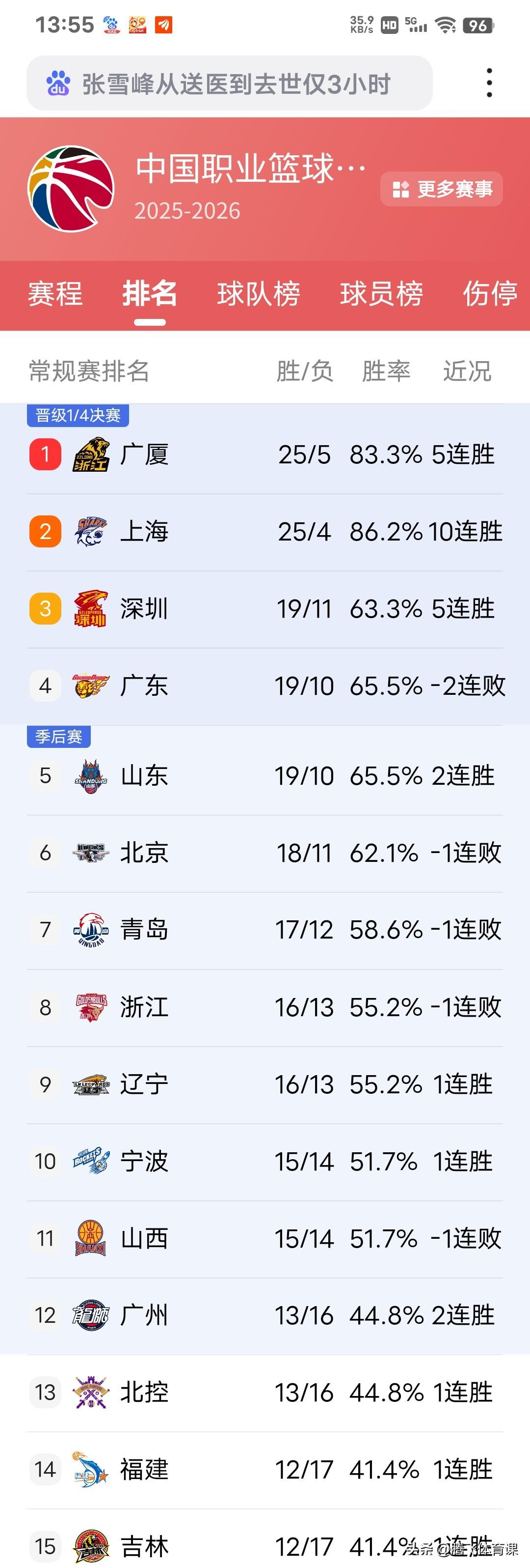 杜锋近期运气爆棚! CBA常规赛第二窗口的比赛已进行了6场比赛,虽然广东队仅取得2胜4负战绩引发球迷和俱乐部的不满,但是球队并没有跌出常规赛前三的排名,而北京北汽本赛季投入同样很大,球队目前排名依然落后于广东队,许利民帅位稳如泰山,所以!杜锋主教练的位置依然不会担心丢掉。 不得不说!杜锋近期运气爆棚,以北京队第二阶段的阵容配置实力完全可以轻轻松松反超广东排名第三,可是许利民不争气,偏偏在球队追分关头爆冷输给福建和吉林,这直接送给了杜锋很大的人情,而山东好不容易追平了广东队战绩,克里斯却意外受伤,广东队凭借双方第一回合交锋赢球又保住第三位置,克里斯的受伤缺席,山东队战绩在近期内想反超广东难度相当之大,更何况接下来的一下场比赛,广东队将回到主场迎战本赛季唯一一支未尝过胜果时四川队,赢球几乎不在话下。 而近期状态同样火爆的深圳队提前赛一场的情况下球队战绩暂时反超了广东,但是今晚比赛过后常规赛排名第三名依然是广东的,深圳队在第二阶段开局三连败也等于帮了杜锋的忙,杜锋近期运气真的是太好了。