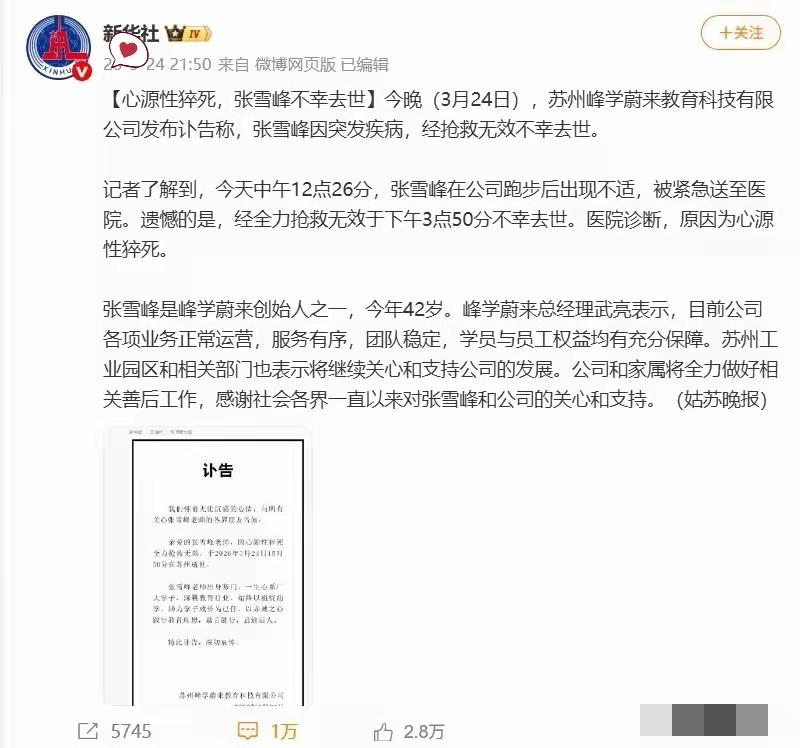 张雪峰只不过是一家个体企业的小老板,他的离世之所以这么轰动,还被多家央媒转述,并给予了他很高的评价,我觉得是因为心源性猝死现象越来越年轻化,现在的年轻人普遍把熬夜、加班、应酬,当成了家常便饭。现在我们的生活水平确实高了不少,但是随之生活压力也与日俱增。尤其是像我们这些跟张雪峰年纪相仿的中年人,有点兔死狐悲,人人自危的感觉。我们这些人有危机感的原因是,年龄说老还早,说小不小。正是上有老,下有小的年纪,不努力拼搏怕承担不起家庭责任,太努力太拼,又感觉是在拿命在赌,不值得。 所以都在告诉我们一个事实,那就是要正视自己的健康,就现阶段而言,甭管你是年轻人,还是中年人,没有什么比健康更重要的了。