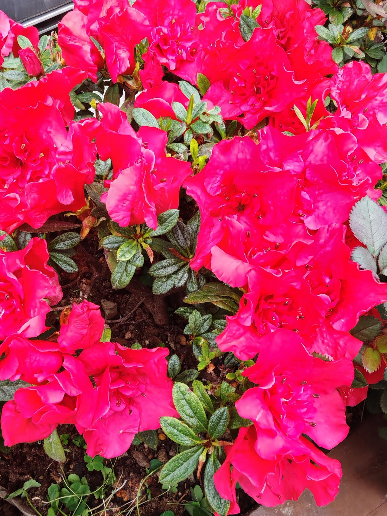 从照片中可以清晰地看到它的几个典型特征: * 花朵形态:花瓣呈现出鲜艳的玫红色或深粉色,花型较大且层层叠叠,属于重瓣品种。花瓣边缘带有波浪状的褶皱,质感像绸缎一样,看起来非常饱满。 * 叶片特征:叶子是深绿色的,表面有明显的纹理(叶脉凹陷),呈椭圆形,簇拥在花朵周围,与艳丽的花朵形成了鲜明的对比。 * 生长状态:这株杜鹃花开得非常繁茂,花团锦簇,正处于盛花期,观赏性很强。 杜鹃花是中国十大名花之一,也是常见的园林观赏植物。这种颜色艳丽、花朵较大的品种,通常是经过园艺培育的西洋杜鹃或杂交杜鹃,很适合作为盆栽摆放在家中或庭院里欣赏。
