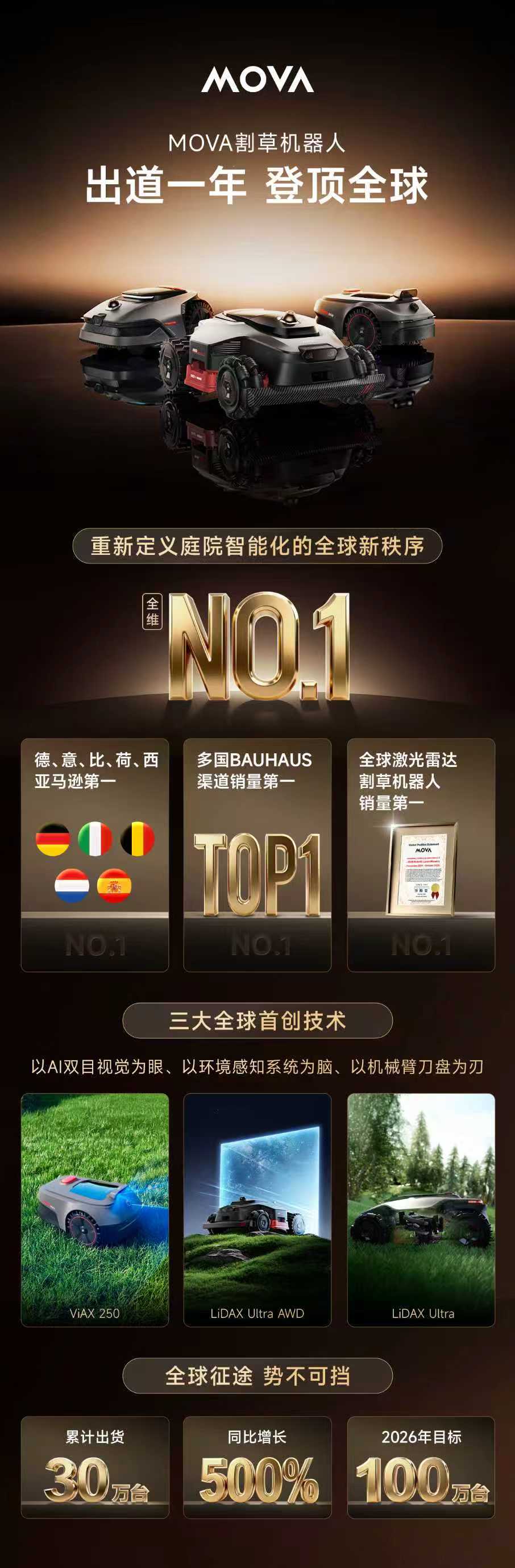 MOVA 割草机出道一年,登顶全球!亚马逊多国Best Sellers榜首多国BAUHAUS渠道销量第一全球激光雷达割草机器人销量第一累计出货量 30 万台,同比增长 500%