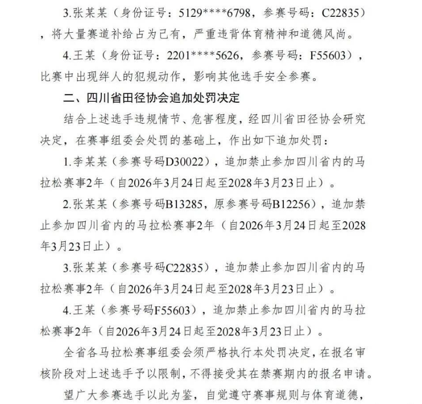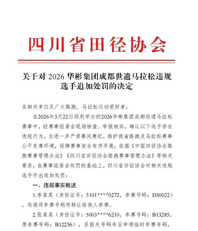 干得漂亮!建议全国推广 四川省田径协会对3月22日成都世遗马拉松违规选手做出追加处罚,四位违规选手被禁止参加四川省内马拉松赛事两年。 四人中有一男一女两个显眼包格外显眼: 一位女选手在赛道上做出一字马动作摆拍,影响其他人的节奏不说,还差点把别人绊倒。 另一位男选手就更令人发指了,你搁这进货来了?装了满满一包能量胶,还用个透明的背包,恐怕别人不知道你活不起吗? 建议其他地区的赛事组委会能向四川学习,对赛场上的不文明行为做出严厉处罚,对这种“进货型”选手,就该当场给他把东西没收。