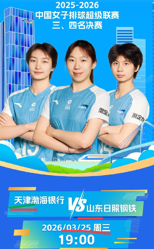 天津渤海银行女排发布今晚季军赛比赛海报!今晚天津女排季军赛以年轻队员挑大梁主打比赛!天津女排年轻队员二传手朱航霆主攻路晶和主攻陈鹤心登上今晚的比赛海报!