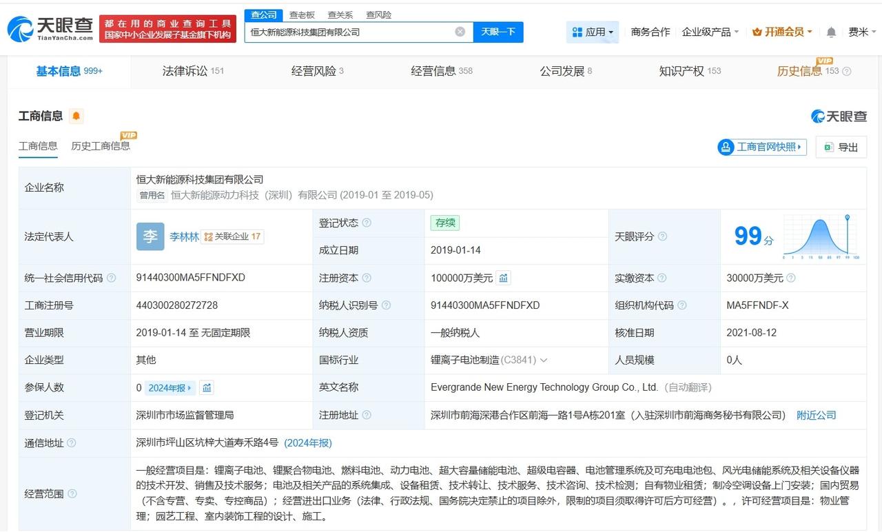 恒大新能源被申请破产审查 恒大新能源被申请破产 天眼查法律诉讼信息显示,近日,恒大新能源科技集团有限公司新增一则破产审查案件,申请人为东莞市泰城食品贸易有限公司,经办法院为广东省佛山市中级人民法院。 恒大新能源科技集团有限公司成立于2019年1月,法定代表人为李林林,注册资本10亿美元,经营范围包括电池及相关产品的系统集成、设备租赁、技术转让、技术服务、技术咨询、技术检测等,由恒大凯宏投资(深圳)有限公司全资持股。 天眼查信息: