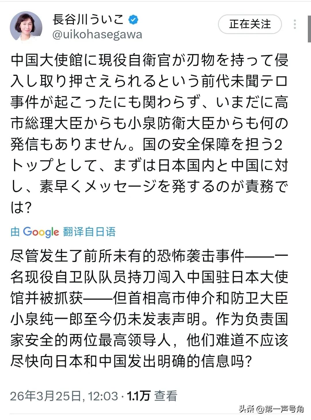 日本政界左翼代表人士长谷川羽衣子今天(3月25日)写道;“尽管发生了现役自卫官携带武器闯入中国大使馆并被制服的前所未有的恐怖袭击事件,但迄今为止,高市首相和小泉防卫大臣仍未发表任何声明。作为肩负国家安全保障的两位高层领导人,难道不应当首先向日本国内和中国迅速传达明确的信息吗?” 评几句 日本令和新选组政策委员长谷川羽衣子3月25日的质问,像一把手术刀精准剖开了东京的虚伪——现役自卫官村田晃大持刀翻墙闯入中国大使馆、扬言"以神的名义杀死中国外交人员",如此恶劣的恐怖袭击事件发生后,首相高市早苗和防卫大臣小泉竟集体失声? 这种沉默绝非偶然。高市早苗十天前还在防卫大学校毕业典礼上鼓吹"不排除任何选项"的激进安保论调,如今面对自家军人的极端暴行,却连一句像样的道歉都吝啬。长谷川的质问直指核心:肩负国家安全保障的领导人,在侵犯《维也纳外交关系公约》的恶性事件面前装聋作哑,这不是失职,是纵容! 从靖国神社"拜鬼"到教材篡改历史,从军费14连涨到"新型军国主义"成势,日本右翼正在系统性孵化极端思想。一个23岁的少尉刚入伍就敢持刀闯外国使馆,这背后是整个国家机器的失管失教。当左翼人士都看不下去站出来喊话,东京的掌权者们还在等什么?等下一个"独走"的军人,还是等东亚安全架构彻底崩塌?