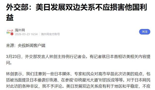 就在刚刚外交部发布声明:日前外交部发言人林剑主持了例行记者会,有记者专门问起日本首相高市早苗访美的事,林剑直接给出了回应。这件事最近在日本国内吵翻了天,很多日本老百姓都在骂自己国家的首相,咱们外交部说的话,既专业又有分寸,大家都该好好听听。 高市早苗这次访美,她3月18日晚从东京出发,19日抵达华盛顿,当天就和特朗普举行了正式会谈。 这次访问是她出任日本首相后首次对美正式访问,本来目的是强化日美同盟、争取美国在经济和安全上的更多支持,结果却让日本国内很多人觉得脸上挂不住。会谈过程中,特朗普提到美国对伊朗的军事行动时,直接拿日本当年袭击珍珠港来类比,说日本最懂得这种出其不意的做法,还当面问高市早苗,你们当年袭击珍珠港怎么没提前告诉我们? 珍珠港事件是美日之间历史上的重大伤疤,二战期间日本偷袭导致美国大量人员伤亡,此后几十年美国历届领导人基本都回避直接拿这件事开玩笑。这次特朗普这么一说,等于把旧账翻出来当笑话讲,日本方面当时没有正面回击。 事后日本舆论把这个细节放大,认为高市早苗在现场没有做出有力回应,显得被动和尴尬。 除了这个言论,白宫还发布了高市早苗参观白宫总统画像走廊的照片和视频。 她在画像前指指点点,表情和姿势被日本网友解读为过于夸张和刻意。照片里她嘴巴张开、手指指向墙上某位总统画像,身体前倾,这些画面传回日本后,社交媒体上骂声一片。 很多人直言看着别扭,觉得她姿态太低,像在刻意迎合特朗普,丢了日本作为主权国家的体面。访美期间,她还承诺向美国投资730亿美元,主要投在小型模块化核反应堆和天然气设施项目上,地点涉及田纳西州、亚拉巴马州、宾夕法尼亚州等地,目的是换取美国在关税政策上给日本更多优惠。 但美方只给了口头肯定,没有签署任何具体协议或给出明确承诺。日本媒体和评论家指出,这笔巨额投资基本是单方面付出,换来的却是模糊表态,实际好处没看到,面子还掉了。 访美刚结束,日本国内反应就很激烈。社交平台上大量转发那些照片和视频,批评声音占主流。 民众觉得高市早苗在特朗普面前表现得太卑躬屈膝,尤其珍珠港那段被当面提起却没回怼,简直是自取其辱。一些日本网民直接说,这种讨好换不来尊重,只会让美国更看不起日本。 媒体分析也跟着跟进,说这次访问花了大钱却没换来对等对待,日美关系里的不对等暴露得更清楚。高市早苗上台后本来就靠对美靠拢、对华强硬来稳固保守派支持,这次却适得其反,国内不满情绪反而上升。 3月23日,中国外交部例行记者会上,有记者问到这件事。发言人林剑回应说,中方注意到日本媒体、专家和民众对高市早苗访美的各种看法,包括会谈中提及珍珠港事件以及参观照片引发的反应。 对于日本国内的具体议论,中方不作评论,因为这是日本内部事务。林剑接着强调,美日发展双边关系本来没问题,但前提是有利于地区和平稳定,不能针对第三方国家,也不能损害其他国家的利益。 这话点得很准。最近一段时间,美日频繁在台海、南海方向搞联合军演、发表针对性声明,拉拢其他国家搞小圈子,这些动作直接指向中国,威胁地区稳定,也触及中国核心利益。 中国一直主张国家间交往要互相尊重、平等互利,不能搞霸权主义,不能拉帮结派针对别人。林剑这番表态保持了外交上的专业和克制,既没直接介入日本国内争论,又清楚表明中方底线。 放在当下台海时政背景下看,这话分量不轻。日本高市早苗政府上台以来,在台湾问题上多次放出强硬言论,配合美国加大对台军售和军事支持力度,试图把台湾地区拉进所谓“印太战略”框架。 这次访美被日本民众骂成“丢脸”,某种程度上也反映出日美同盟内部的裂痕和不平衡。美方要日本出钱出力当马前卒,日本却得不到相应回报,民众自然不干。 从整个事件看,高市早苗想通过访美巩固地位、换取实惠,结果国内反弹更大。投资承诺已经启动,但关税优惠迟迟没影,执政压力只会增加。 中国外交部的回应则把球踢回美日一边:你们双边关系随便搞,但别踩红线,别损害别人。现实里,美日如果继续往台海方向拱火,只会让地区更紧张,到头来吃亏的还是他们自己。 普通人看这事儿也明白,靠低姿态换不来真正尊重,只有实力到位了,别人才会平等相待。这次外交部表态,话不多,却把道理讲得透彻。