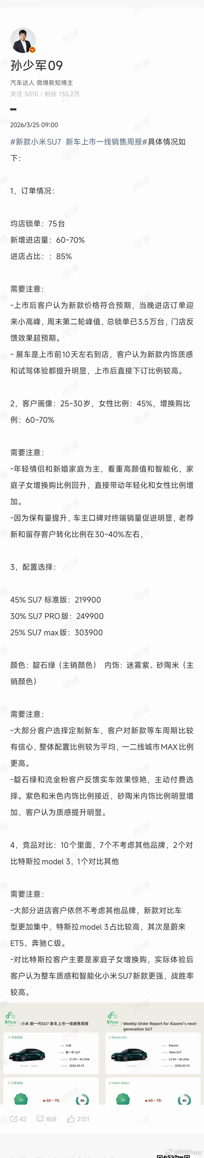 孙少军那报告看得人一愣一愣的:十个进店客户,七个根本不看别的品牌,直接奔着小米来。新款对比最狠的还是Model 3,但客户一坐进车里、一上手智能系统,胜负基本就定了。报告原话:“整车质感和智能化,小米SU7新款更强,战胜率较高。”