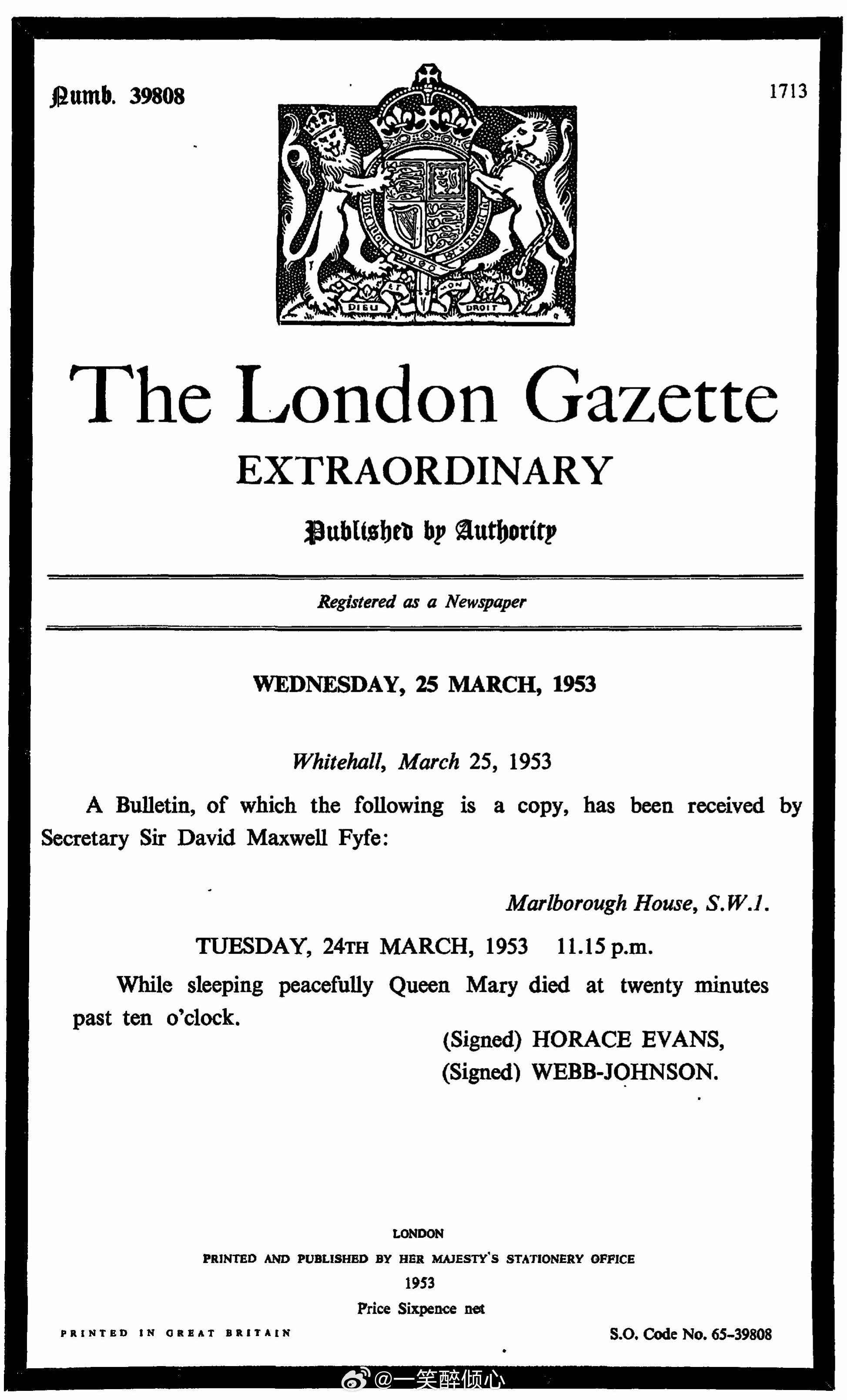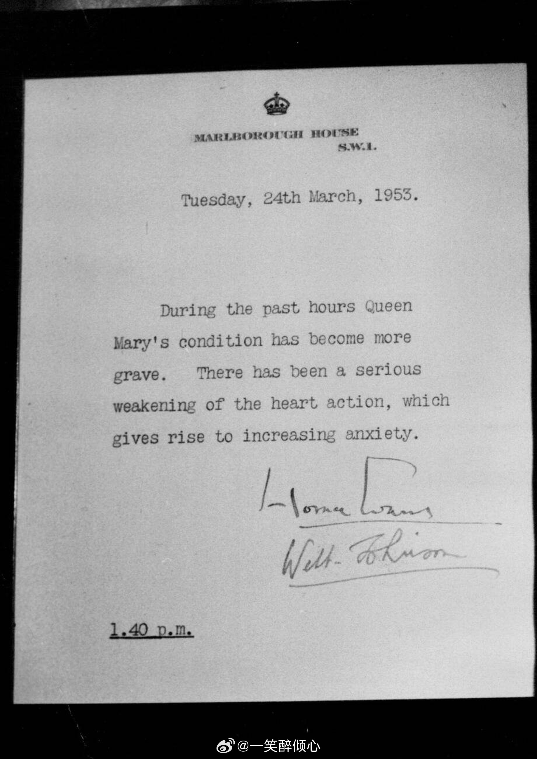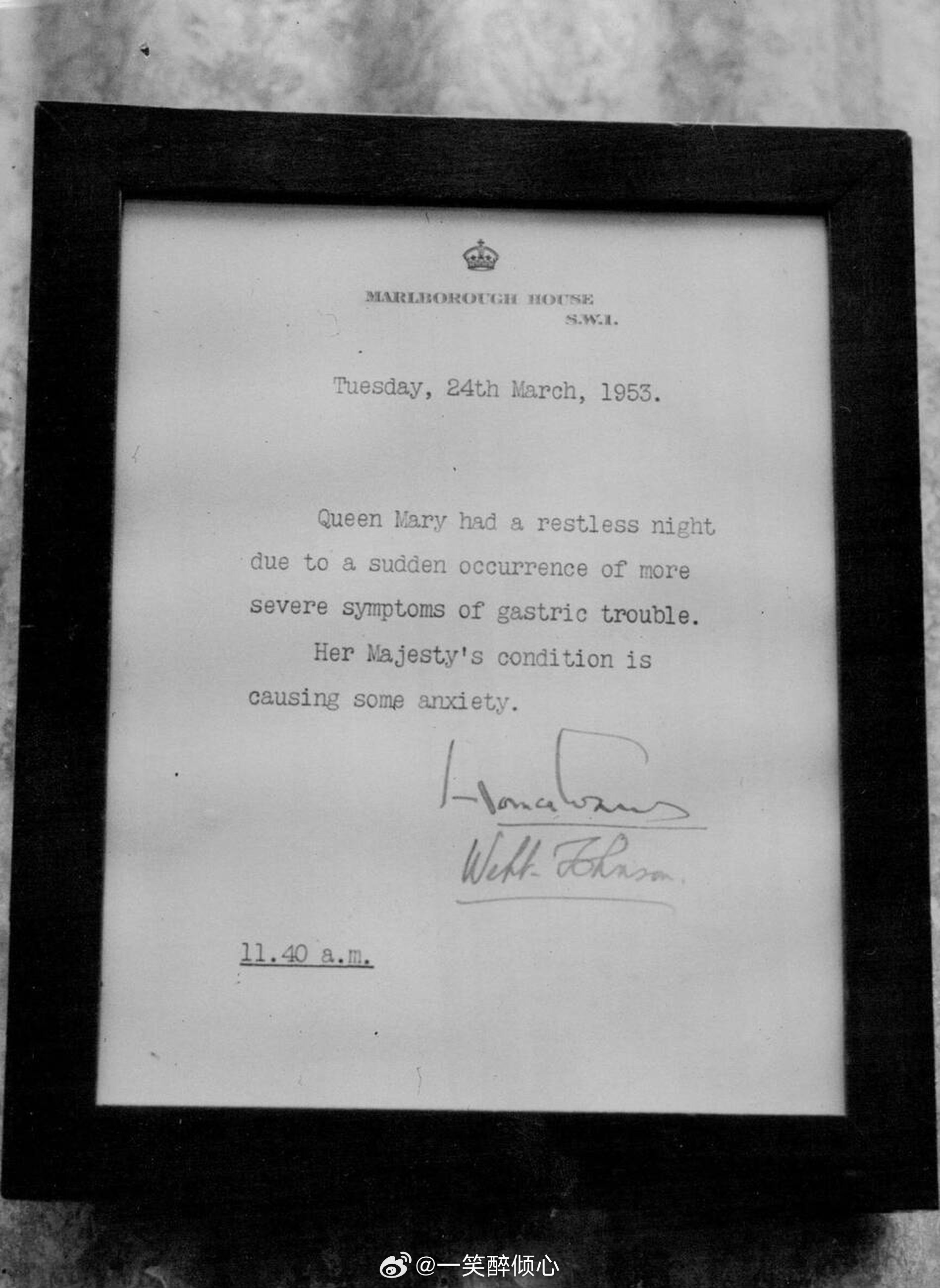 1953年3月24日,玛丽王后在伦敦马尔伯勒宫病逝,享年8️⃣5️⃣岁🖤据记载,玛丽王后是晚上10点20分在睡梦中病逝,她逝世前几个小时是整晚都睡不好觉,胃部变得更加不舒服搞得她很焦虑,短短几个小时内病情变得愈发恶化,心脏功能出现了严重的衰退,变得更加焦虑,她就是这么没了的。