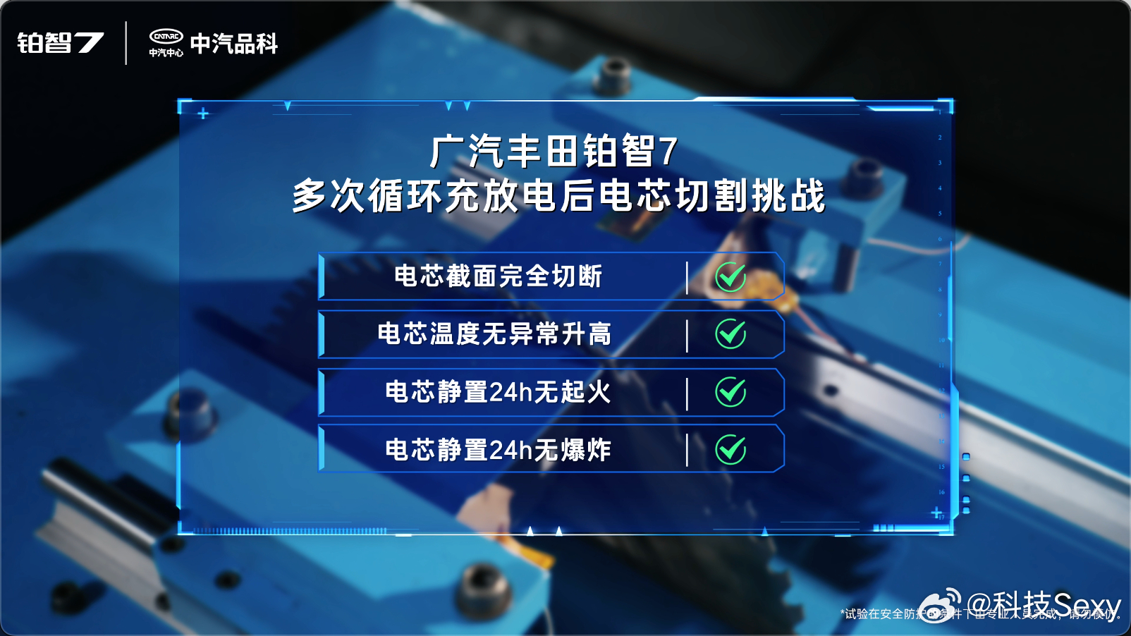 聊到铂智7的安全,中汽中心最近搞了批极端测试,光看“电芯切割”这一项就够硬核——不管是全新电芯,还是跑了800次循环(相当于30万公里)的老电芯,切完温度愣是没异常升高,静置24小时也不起火。这模拟的就是真撞车时电芯被扯断的极限情况。