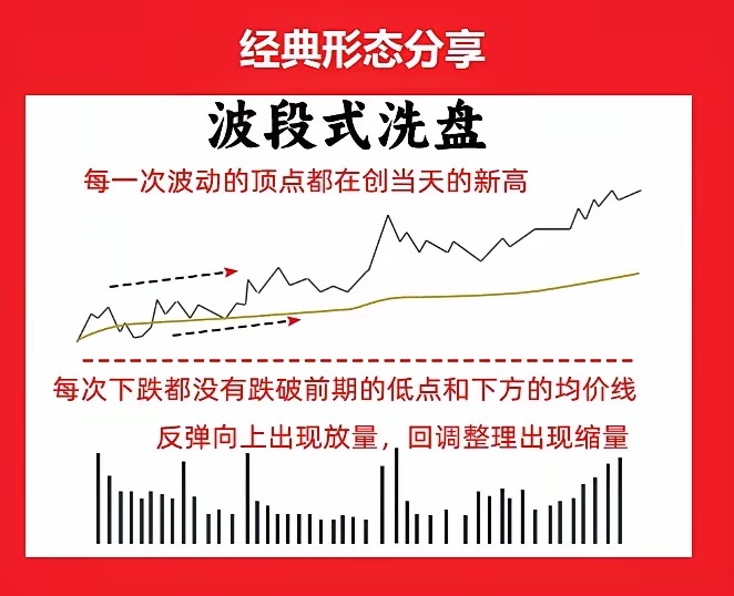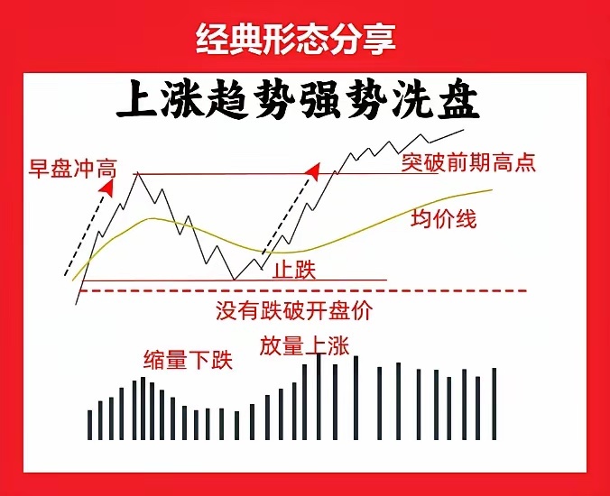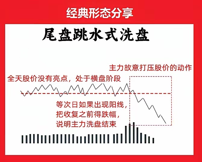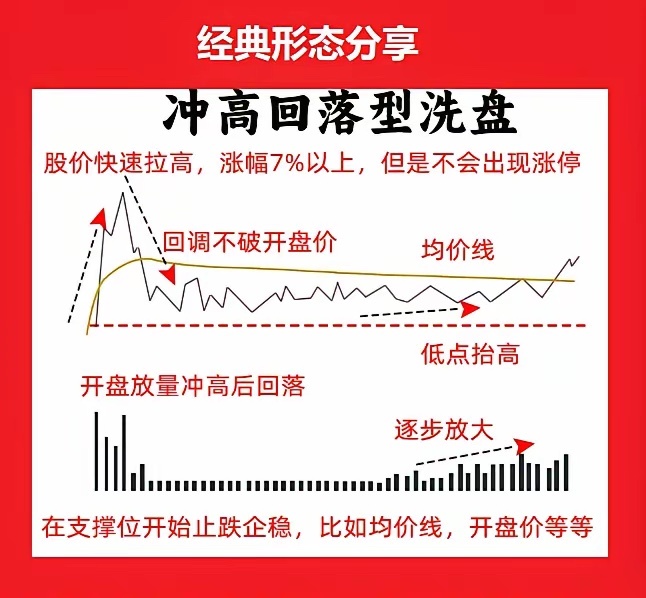 大多数散户在实战中,最难跨过的坎,就是分不清主力到底是洗盘还是出货。尤其是分时图这种实时博弈的战场,稍不注意就被情绪带着走。今天我把六种经典的分时洗盘形态整理出来,顺序不变,建议大家反复揣摩。老规矩,觉得有用的点个赞,评论区打个“666”,后面继续分享实战干货,免得回头找不到了。一、冲高回落型洗盘这种走势在分时图上很有欺骗性。盘中突然直线拉升,涨幅能到7个点左右,但主力偏偏不去封板,随后股价开始缓慢回落。到了收盘,往往只是平盘或微涨。核心是两点:一是拉升的位置是否在关键区域,二是冲高后的回调是否明显缩量。如果是缩量回落,说明筹码没松动,更多是心理层面的清洗。二、上涨趋势中的强势洗盘这种一般发生在上升趋势已经确立的分时里。盘中股价突然出现一波快速下跌,但仔细观察,下跌时成交量并没有放大,反而很冷清。随后股价止跌回升,伴随成交量放大,并且一举突破前面的高点。整个过程里,分时均价线始终是向上走的,说明主力并没有真正撤退,而是在拉升过程中顺势洗掉浮筹。三、波段式洗盘分时图上呈现出一波上涨、一波下跌、再涨、再跌的反复走势。但关键点在于,每次回调的低点都在逐步抬高,而整体涨幅却并不大。这种走法最磨人,很多散户拿不住。主力的意图是用时间换空间,让不坚定的筹码在反复震荡中自行离场。四、尾盘跳水式洗盘前面大部分时间股价都在横盘整理,波澜不惊。到了尾盘,突然出现一波急跌,跌幅通常在3%以上。但仔细看,下跌过程中成交量并没有明显放大,收盘时K线往往收出十字星或长下影线。这种手法利用的是尾盘情绪容易放大的特点,用最小的成本制造恐慌,清洗短线盘。五、炸板分时洗盘股价在分时中一度封上涨停,随后炸板回落,但跌幅不大,接着再次回封涨停。如此反复,可能出现多次炸板再封的动作。这种走势通常会伴随换手率的明显放大,常见于首板之后、向二板进发的阶段。主力通过反复开板制造分歧,清洗追涨的浮筹,为后续拉升减轻压力。六、横盘震荡型洗盘全天分时走势像织布机一样,窄幅波动,几乎没什么波动。成交量持续萎缩,盘面看上去毫无生气。这种走势其实是主力已经高度控盘、锁仓不动,散户在里面待着最考验耐心。横盘缩量,往往是洗盘的末端信号。以上就是六种常见的分时洗盘形态,下方我也配了对应的案例图,建议大家对照着多看几遍,把形态特征印在脑子里。如果有什么不明白的地方,欢迎留言交流。这些都是最基础但也最实用的内容,真正吃透了,对看盘会有很大帮助。