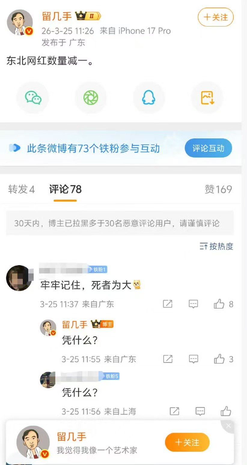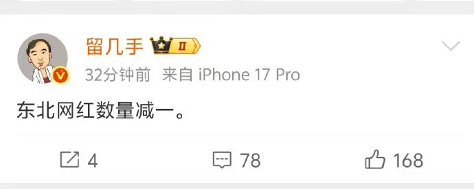 留几手发文东北网红数量减一