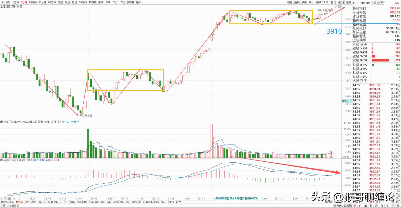 大盘今天继续向上修复,已经在尝试封闭缺口,但整体量能还是不太理想,持续缩量向上反而会不断积累风险,随时快速拐头向下,但鉴于前面持续下跌造成的情绪影响,资金观望也是情理之中,如果明天继续向上,甚至完成缺口封闭,那场外资金就要开始蠢蠢欲动,毕竟缺口封闭就意味着填坑结束,很有可能直接开始新一轮的上涨。目前日线级别也算给出了底分型看多结构,基本确认了短线止跌信号,风险也暂时解除,可以积极操作。 从5分钟图上看,这里已经构建完成两中枢上涨结构,而且已经出现强有力的背驰买点,如果明天继续缩量,那就要注意反弹结束的信号,回落支撑位关注中枢下沿3910点附近,只要这个位置被有效跌破,那反弹宣告结束,开始二次探底。