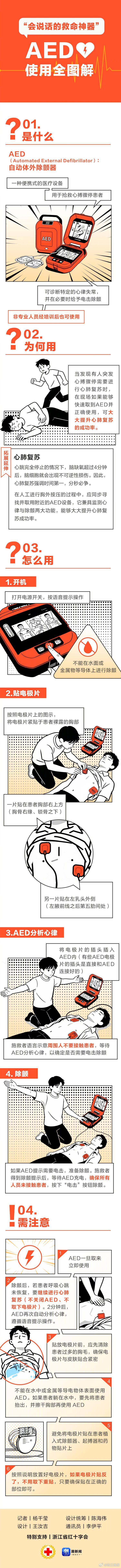 【#AED使用全图解#】一旦发生心源性猝死,最有效的救治手段就是心脏除颤和心肺复苏。如果能在心脏骤停后,进行除颤等正确急救方式,就能为后续治疗赢得时间。“救命神器”AED怎么用?把这张图收藏进手机!(潮新闻 特别支持 浙江省红十字会)#心源性猝死急救最忌打车去医院##朋友圈跑步打卡##嘴唇发紫 心脏不好#
