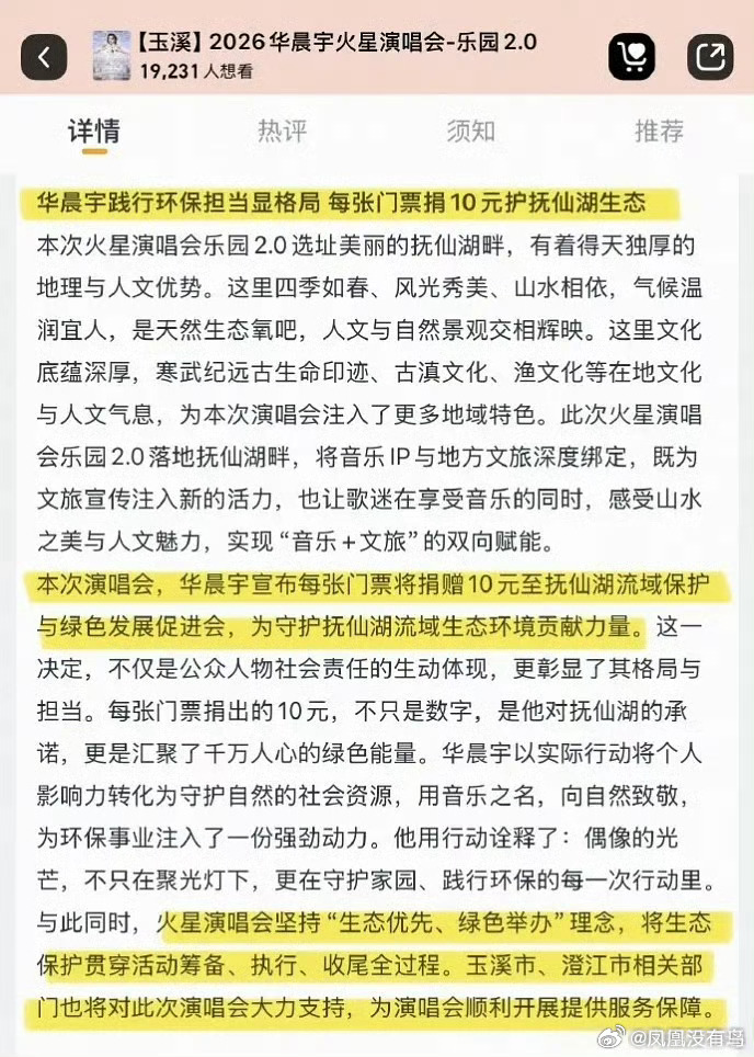 华晨宇人好,火星人也好华晨宇乐园演唱会2.0每卖一张票将捐款10元,开一站演唱会能捐出数百万延续13年以来演唱会是“回家”的传统,实实在在把玉溪当成自己的家去建设,为守护抚仙湖流域生态环境贡献自己的力量。 2026华晨宇火星演唱会华晨宇演唱会连续12年票价未涨华晨宇每张门票捐赠10元