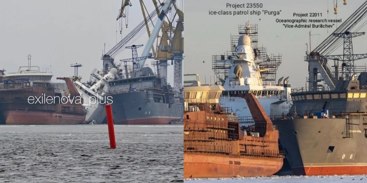 乌军对俄罗斯维堡港发动夜袭之后,将建造中的23550型破冰巡逻舰“普尔加”号炸的舰体没入水中,并且该舰的上层建筑倒在旁边的22011型研究船“布里利切夫中将”号上,导致后者舰体也倾斜了。