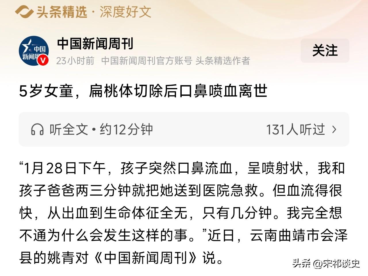 云南曲靖5岁女童做扁桃体切除手术后,出院次日就口鼻喷血,短短几分钟内便失去生命体征,一场被医生称为“微创小手术”的常规治疗,竟成了夺命噩梦。 女童因打鼾就医,医生诊断为扁桃体肿大并建议手术,术中大出血输血却未及时告知家长,术后仅观察两天就允许出院,出院前孩子已出现鼻出血,医生也未提醒风险。 司法鉴定明确,孩子死因是术后创面突发大出血,致急性失血性休克。 家长质疑医院术前未做睡眠监测、术中主刀医师与承诺不符、术后未尽风险告知义务,可医院却称手术无问题,让家长自行找证据,相关部门的调查也迟迟没有回应。 常规扁腺手术频频出意外,是医生经验不足,还是医院监管缺位?这迟来的真相,何时才能还给女童一个公道?