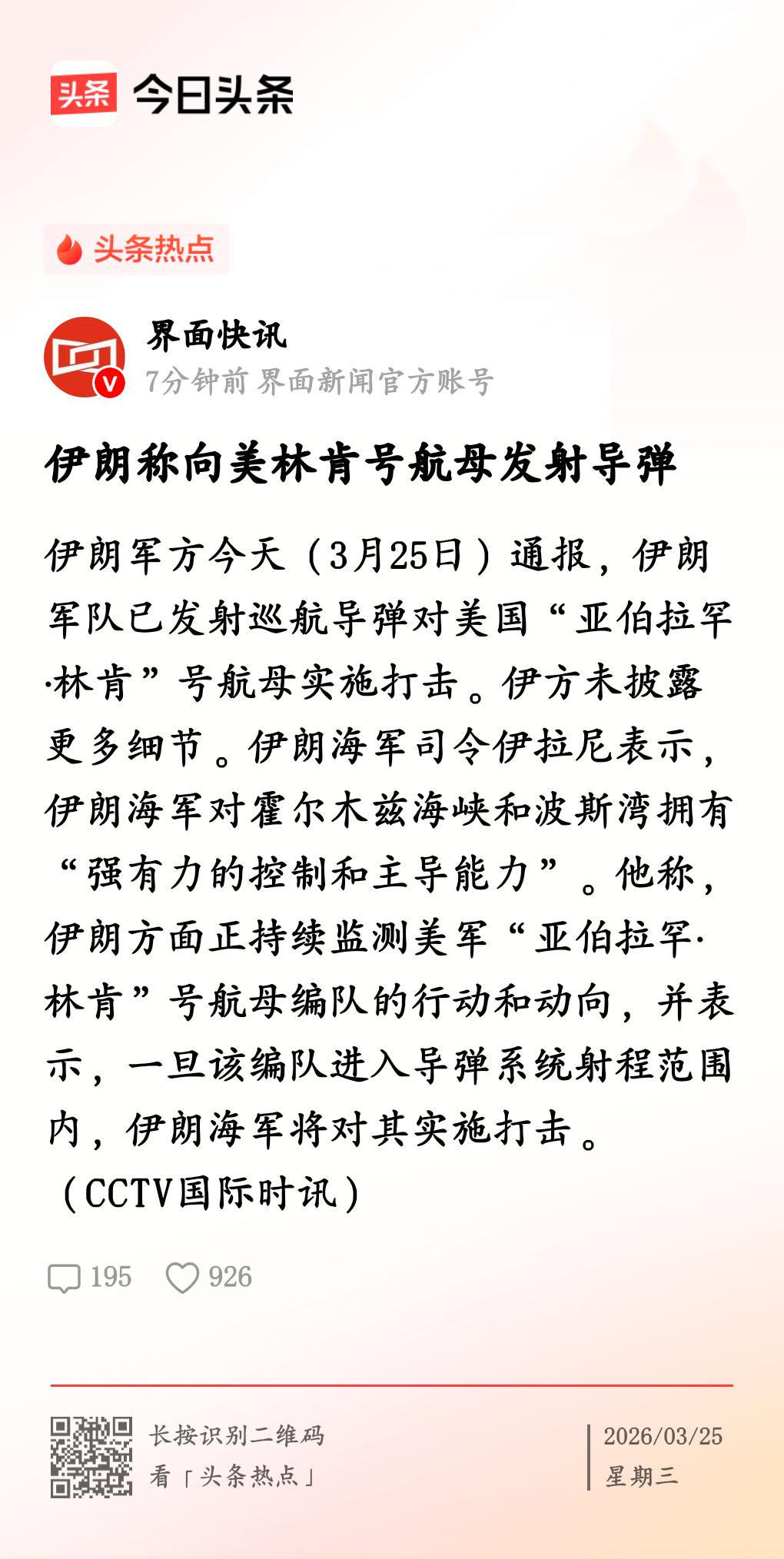 “林肯”号再度沦为靶标 伊朗军队3月25日再次向“林肯”号发射巡航导弹实施打击。只要美国航母进入伊朗的射程范围,伊朗便会毫不犹豫地立即发射导弹。目前,美国航母对伊朗导弹也忌惮三分。