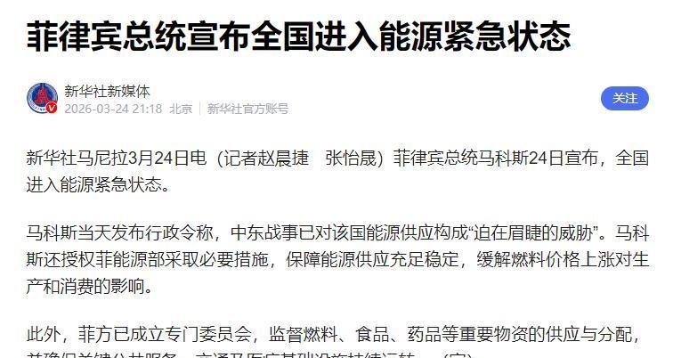 亚洲各国都没想到的一幕:马科斯突然对华示好,还大夸中国善良,这背后到底藏着什么算计? 谁能想到,一向在南海问题上跳得最欢的菲律宾,突然对中国露出了“笑脸”。 3月24日,马科斯公开释放合作信号,还当众称赞中国“相当善良”。这和他过去几年在相关事务上的强硬姿态,简直判若两人。 问题是:一个曾经毫不留情撕毁合作协议的人,为什么突然180度转向?是真心悔过,还是迫不得已的表演?美军全程保持诡异的沉默,这种反差背后,到底藏着什么无法明说的隐情? 事情没那么简单。就在同一天,菲律宾宣布进入全国能源紧急状态,政府呼吁民众节约能源,优先保障交通、金融等关键领域。就在几天前,菲律宾能源部门还信誓旦旦地说储备充足,短短几天就出现如此大的反转,能源危机显然比外界预想的严重得多。 为了填上这个窟窿,菲律宾甚至做出了五年来从未有过的举动——根据路透社消息,菲律宾将完成2021年以来的首次俄罗斯石油进口,一艘载有10万吨ESPO混合油的油轮,正驶向菲律宾巴丹港。连一直回避的采购渠道都紧急启用,菲律宾的能源缺口已经到了火烧眉毛的地步。 如果缺口补不上,全国民航大面积停飞的极端情况随时可能发生,对本就疲软的经济更是致命打击。 能源危机只是压垮马科斯的第一根稻草,更深层的压力,来自国内经济和政治的双重绞杀。 除了能源告急,菲律宾农业同样面临巨大压力。全球化肥供应链剧烈动荡,直接影响国内粮食种植。就是在这样的背景下,马科斯才主动提及中国在危机中提供了帮助,并释放合作信号。 更讽刺的是,他竟然公开表态要把领土分歧和双边贸易合作分开对待。这话从他嘴里说出来,简直是最大的笑话。早在2018年,中菲就已经签署相关合作意向协议,双方当时诚意满满。可2022年马科斯上台后,菲方立刻单方面撕毁协议,自己折腾了几年,原本前景明朗的项目被搞得一塌糊涂。如今国内危机爆发,又转身想重启合作,还提前把高帽给中国戴上——如意算盘打得真是精。 看到这里,很多人会问:是不是经历了这场危机,马科斯终于认清了现实,想要调整对外策略?答案是否定的。这场看似主动的示好,从头到尾只是一场逢场作戏的权宜之计,没有半点长期合作的诚意。 菲律宾国内专业分析早已点破:马科斯家族的大量资产存放于美西方国家。这些资产既是他为自己留的后路,也是外界拿捏他的核心筹码。只要这些资产还在对方手里,他就不可能彻底改变对外基本立场,更不可能做出损害背后相关方利益的决定。 真正让他着急低头的,是一路暴跌的民众支持率。根据菲律宾官方民调数据,截至2025年12月,马科斯支持率已经跌至21%,创下阿罗约卸任之后的历史最低值。国内不满情绪持续发酵,若支持率继续下滑,他随时面临被弹劾下台的风险。一旦失去总统宝座,等着他的绝不是安稳退休——现任副总统莎拉与他有着不可调和的政治分歧。若莎拉接任,他不仅无法依靠家族资产在海外安度余生,连自身处境都无法保障。 也正是因为这样,他才急着在这个时候释放合作信号,想靠外部合作缓解国内危机、拉抬支持率、保住权力。这场示好,说到底只是自保的一场表演。 但这场闹剧不仅没让马科斯占到多少便宜,反而给整个亚洲上了最现实的一课。 在这次危机中,远在大洋彼岸的国家只会口头表态,根本不会拿出实际行动解决民生难题。区域内的稳定与发展,终究要靠区域内国家之间的互利合作来实现。这一点,从近期亚洲各国的动作就能看得清清楚楚—— 就在3月中旬,日本首相与新加坡总理举行会谈,双方将双边关系升级为战略伙伴关系,明确要持续推进自由贸易与双边经济合作。全球贸易规则面临冲击的当下,两国的动作本质上都是在为区域经济稳定寻找出路。除了和日本深化合作,新加坡也在同步推进与区域内其他国家的往来。 不止是新加坡,近期不少亚洲国家都在主动推进区域内的互利合作。大家都看得明白:只有区域内国家携手合作,才能抵御全球经济动荡带来的风险;只有靠互利共赢推进合作,才能保障本国民生与发展。靠远在海外的国家画饼,终究解决不了实际问题。 说到底,国与国之间的相处,靠的从来不是一时的投机取巧,而是长久的真诚相待。想要靠临时抱佛脚的示好解决眼前危机,危机一过就翻脸不认人,最终只会搬起石头砸自己的脚。 只有放下分歧,秉持互利共赢的原则推进合作,才是符合各国共同利益的长久之道。